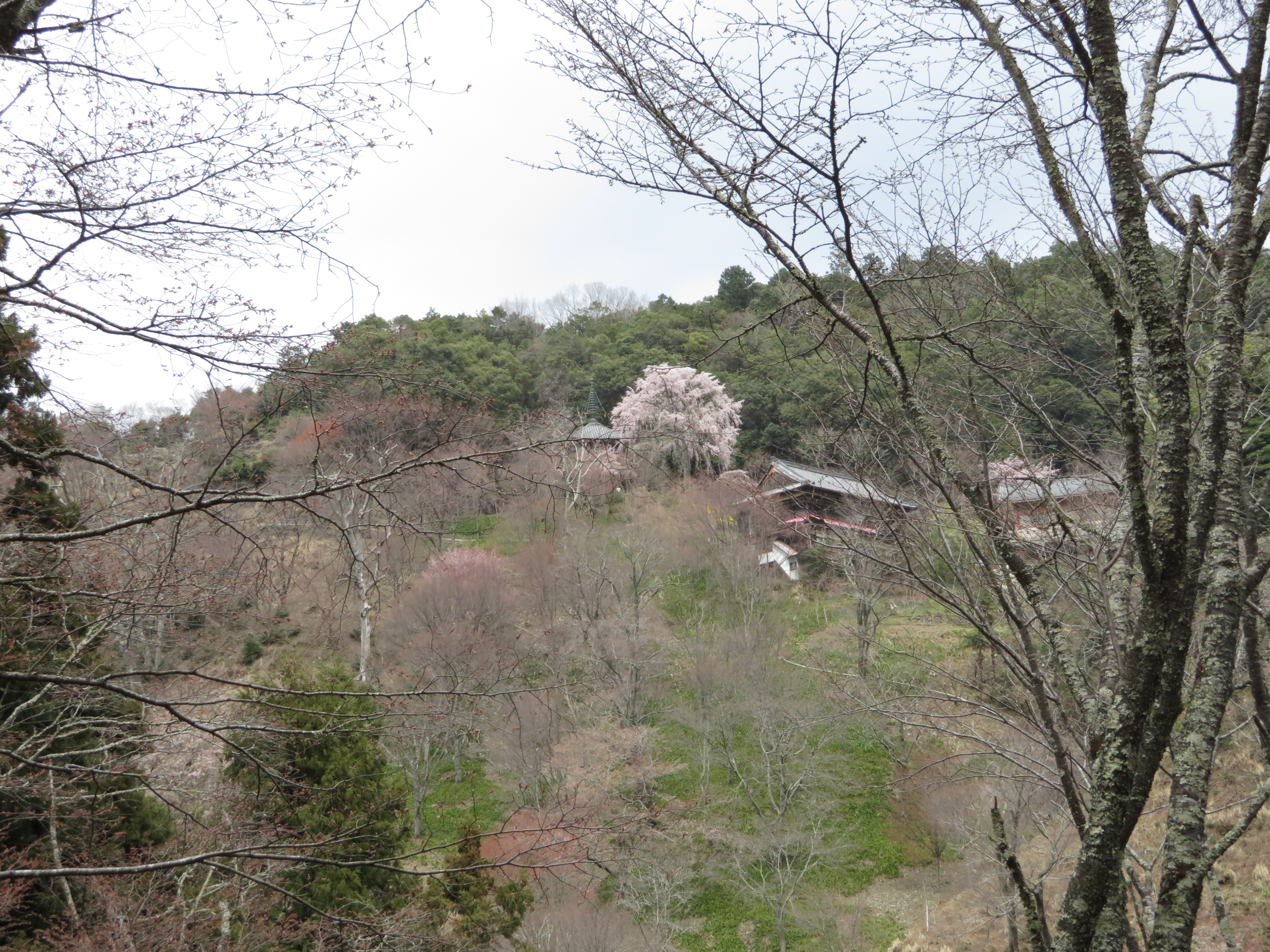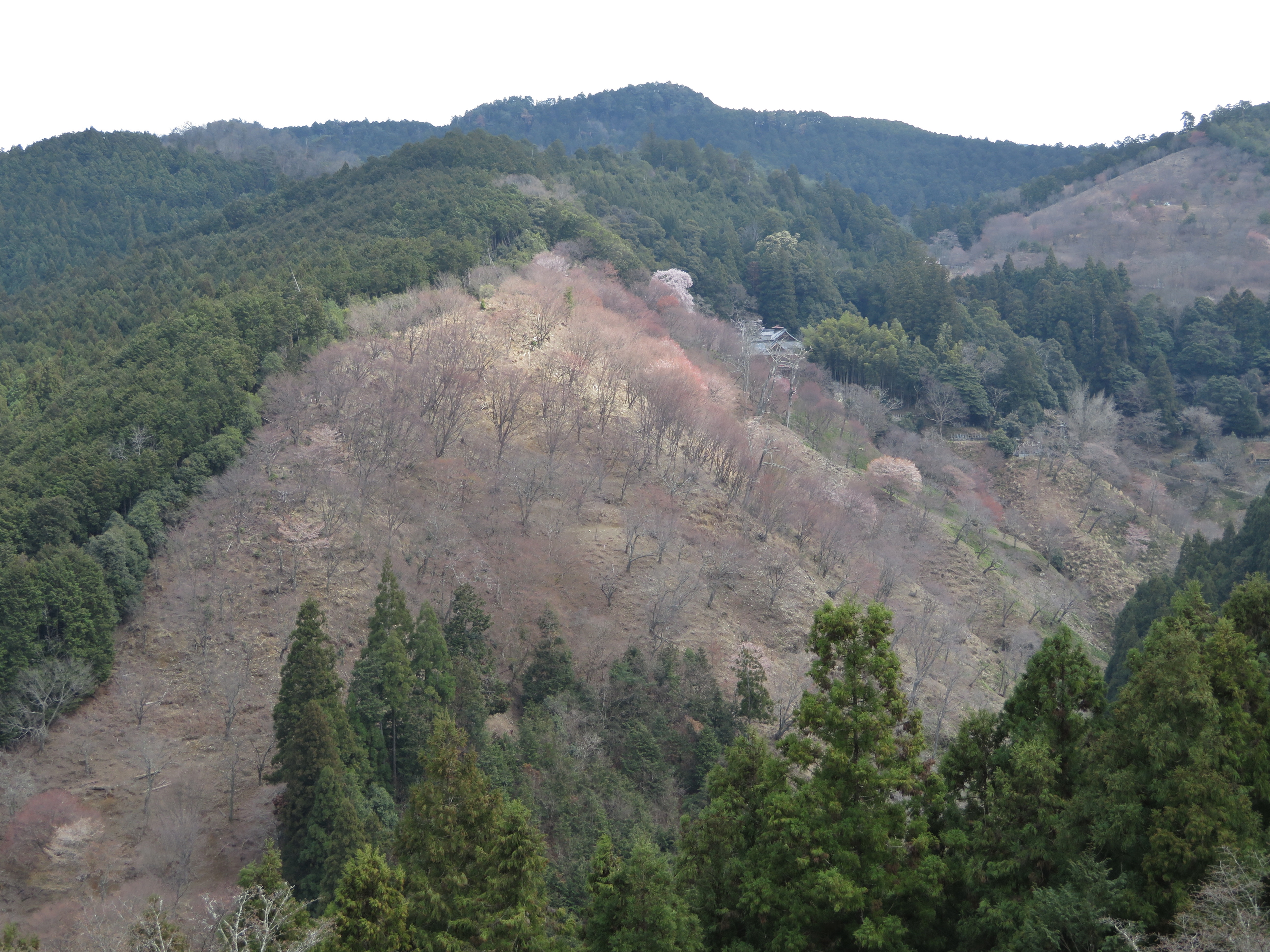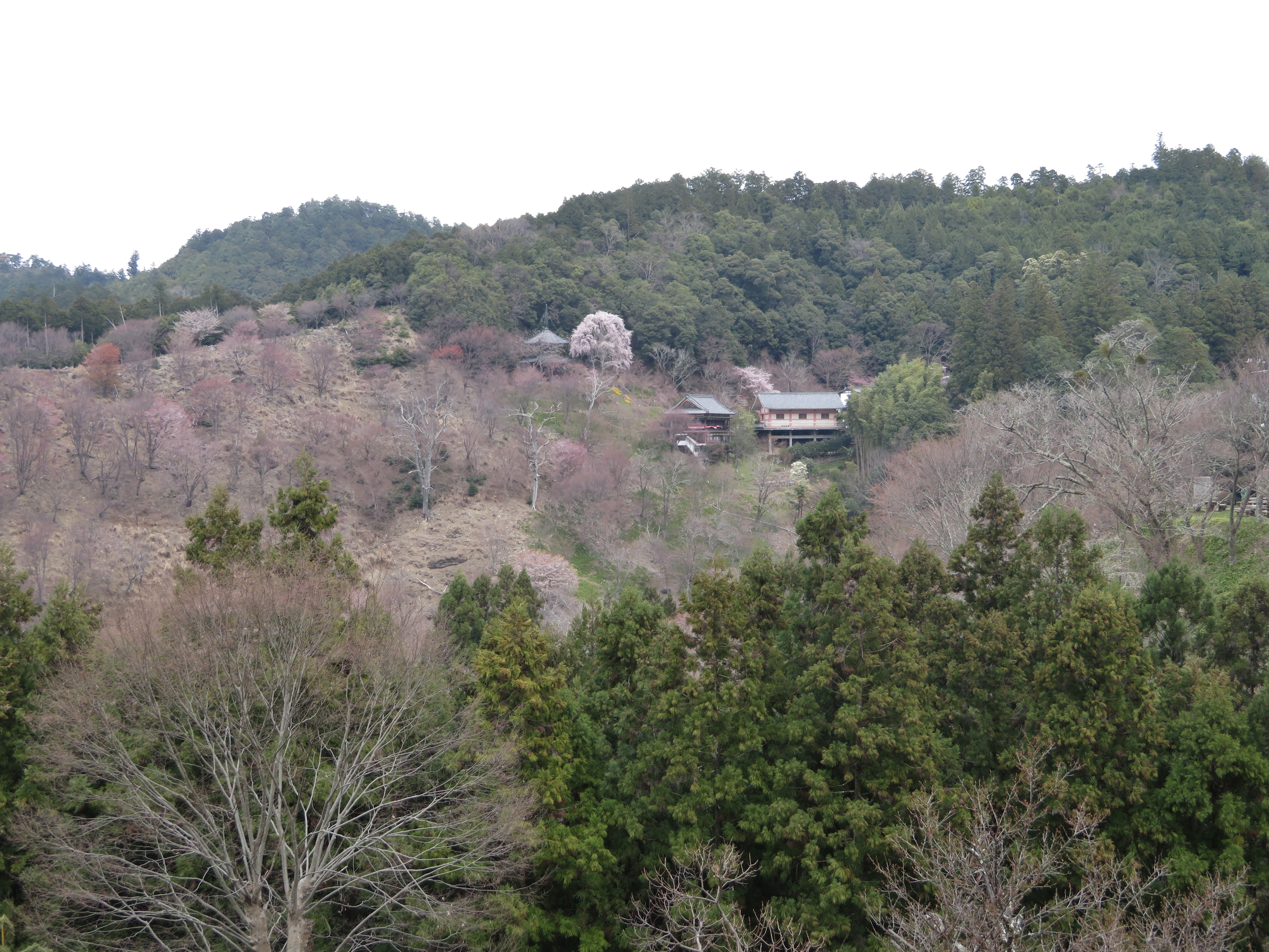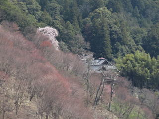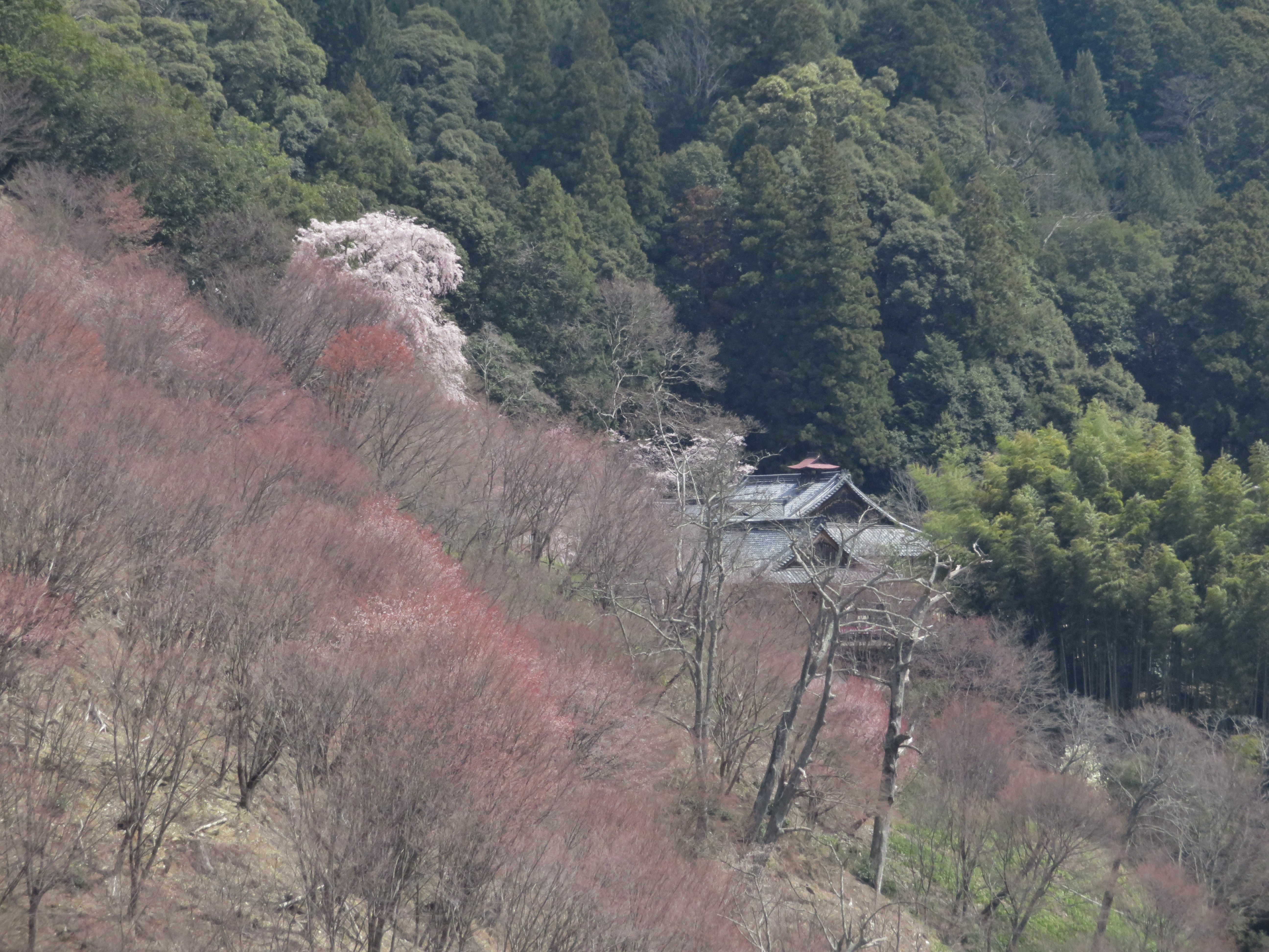 | 有名な吉水神社からの一目千本では、悲しいかなサクラは殆ど咲いてなくて、遠く彼方に 一本満開のしだれ桜が見えたので、その桜がある如意輪寺に向かいました。 |