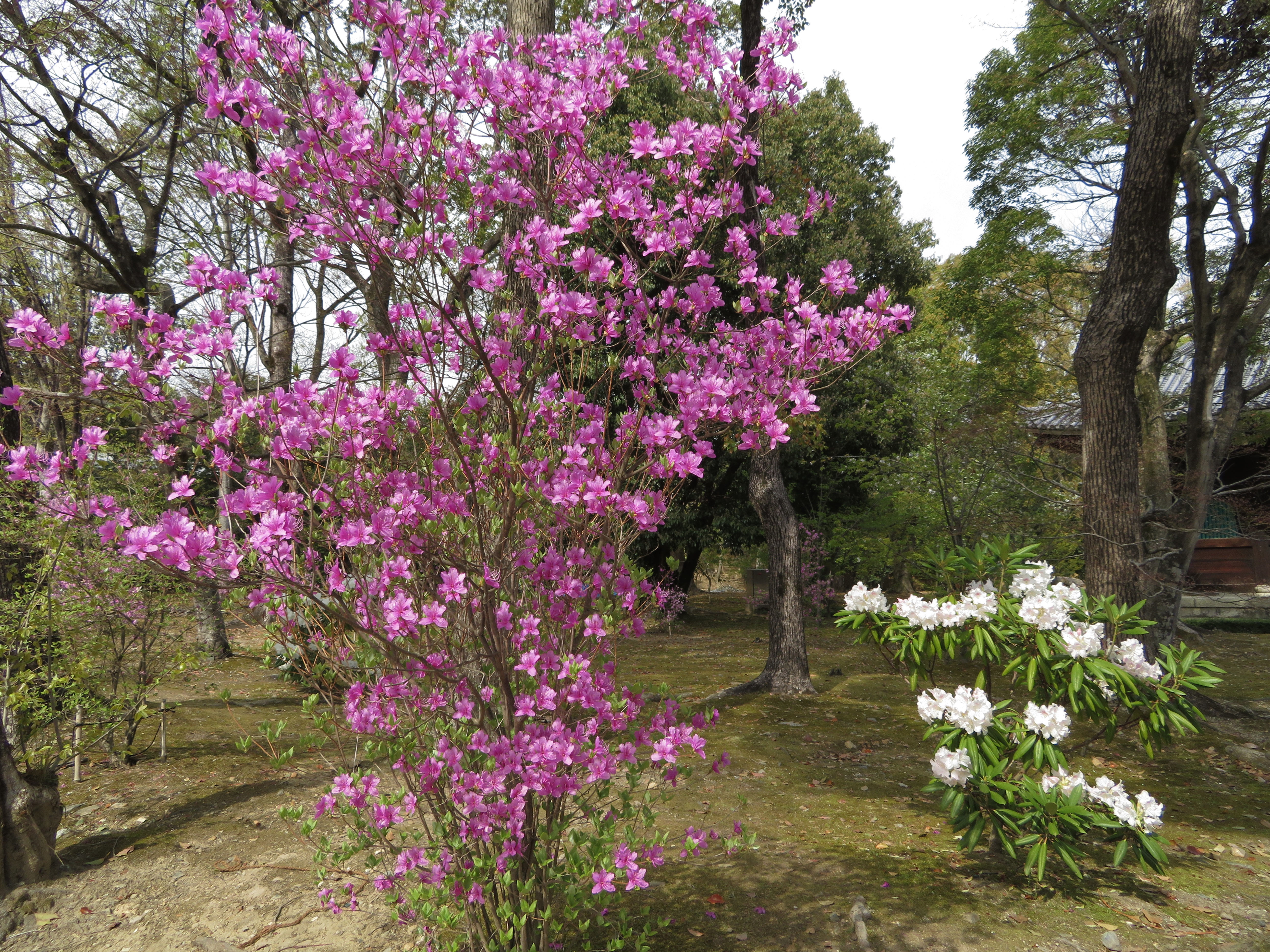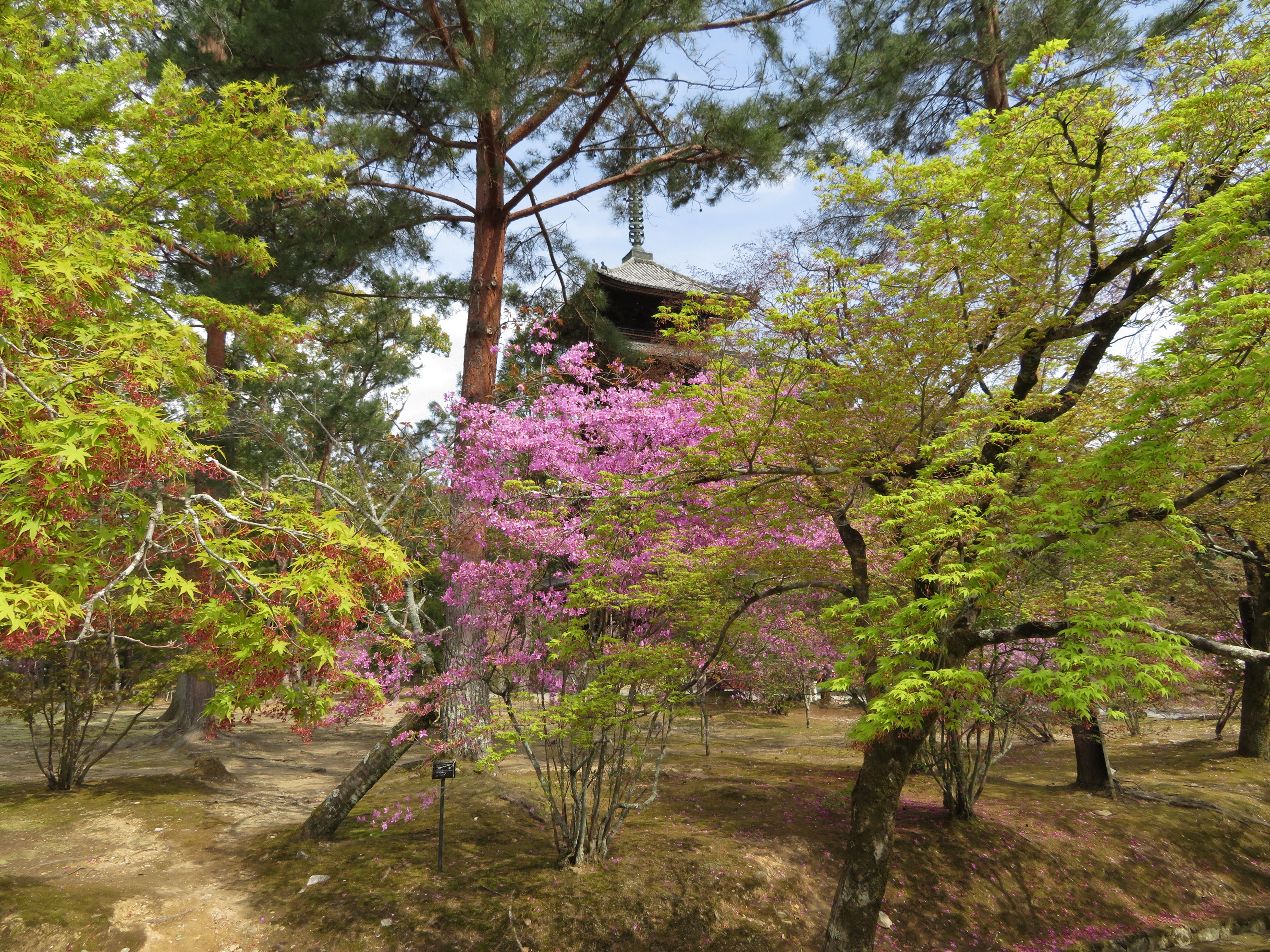 | 仁和寺に着いたら入口に、‘散りぞめ’とあったので入るかどうか迷いました。 満開の時期と比べようもないのですが、大勢の人が来ていました。 ミヤマツツジとかシャクナゲそして新緑のモミジが綺麗でした。 |