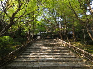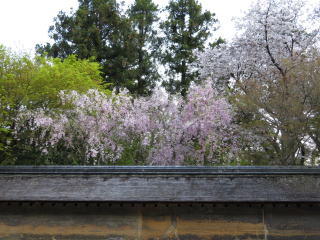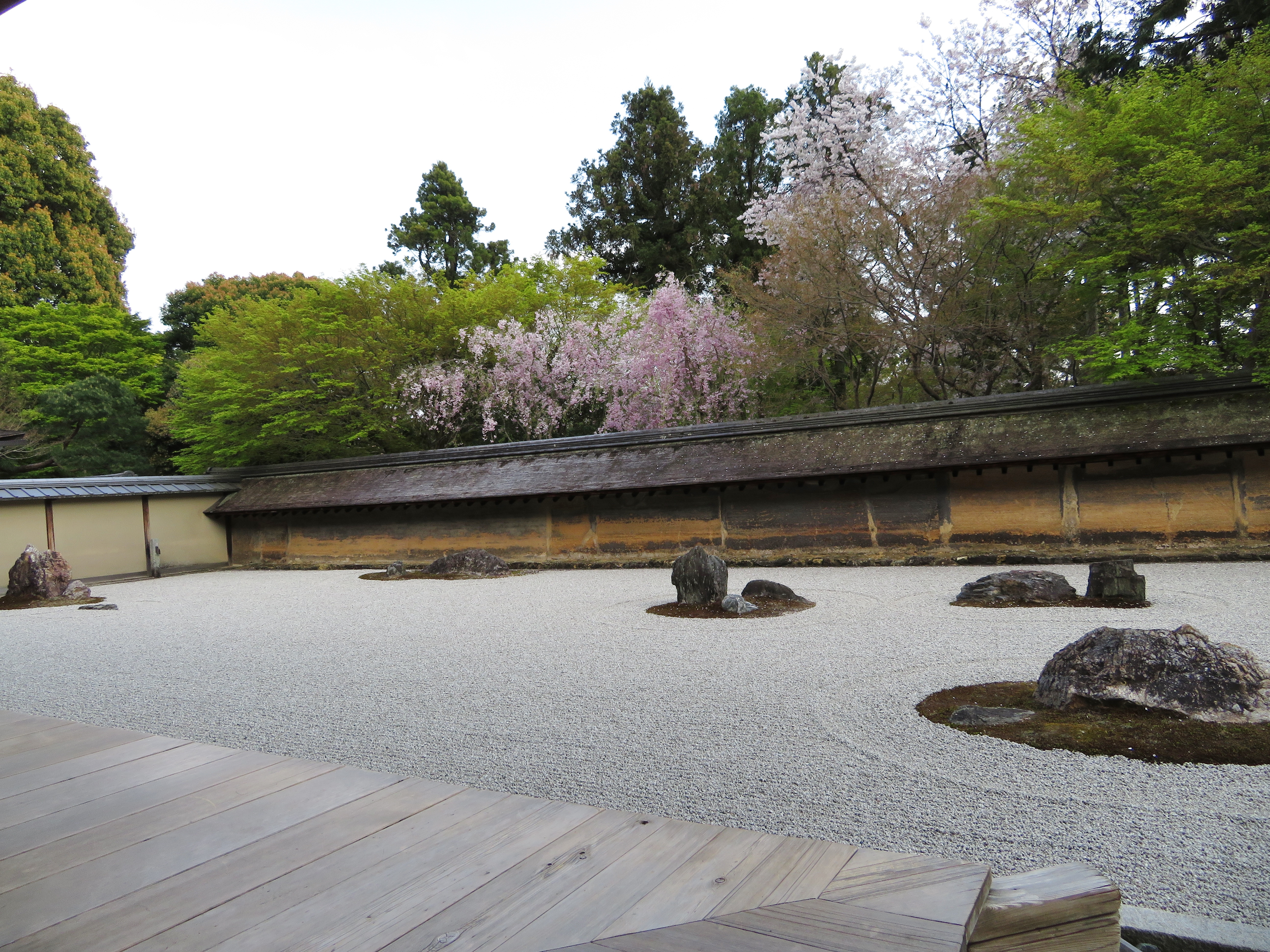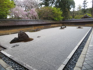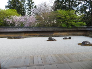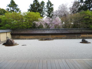 | 以前に来た時は、後ろの枝垂桜が満開で本当に綺麗でした。もちろん人も 一杯でしたが・・・・。 今回は三・四人しかいなくて、話し声も無く静寂の中で石庭の前に座っていました。 |
