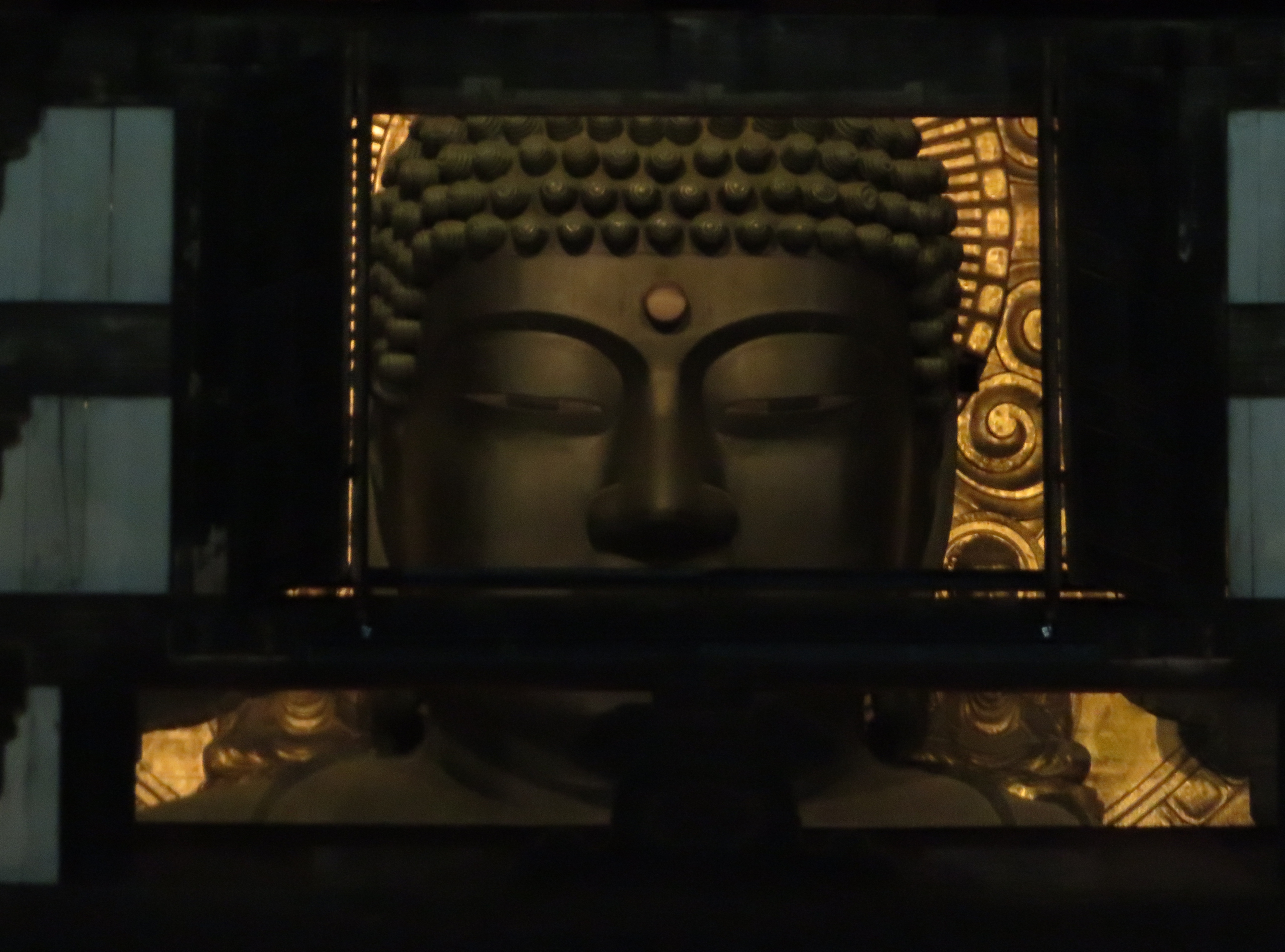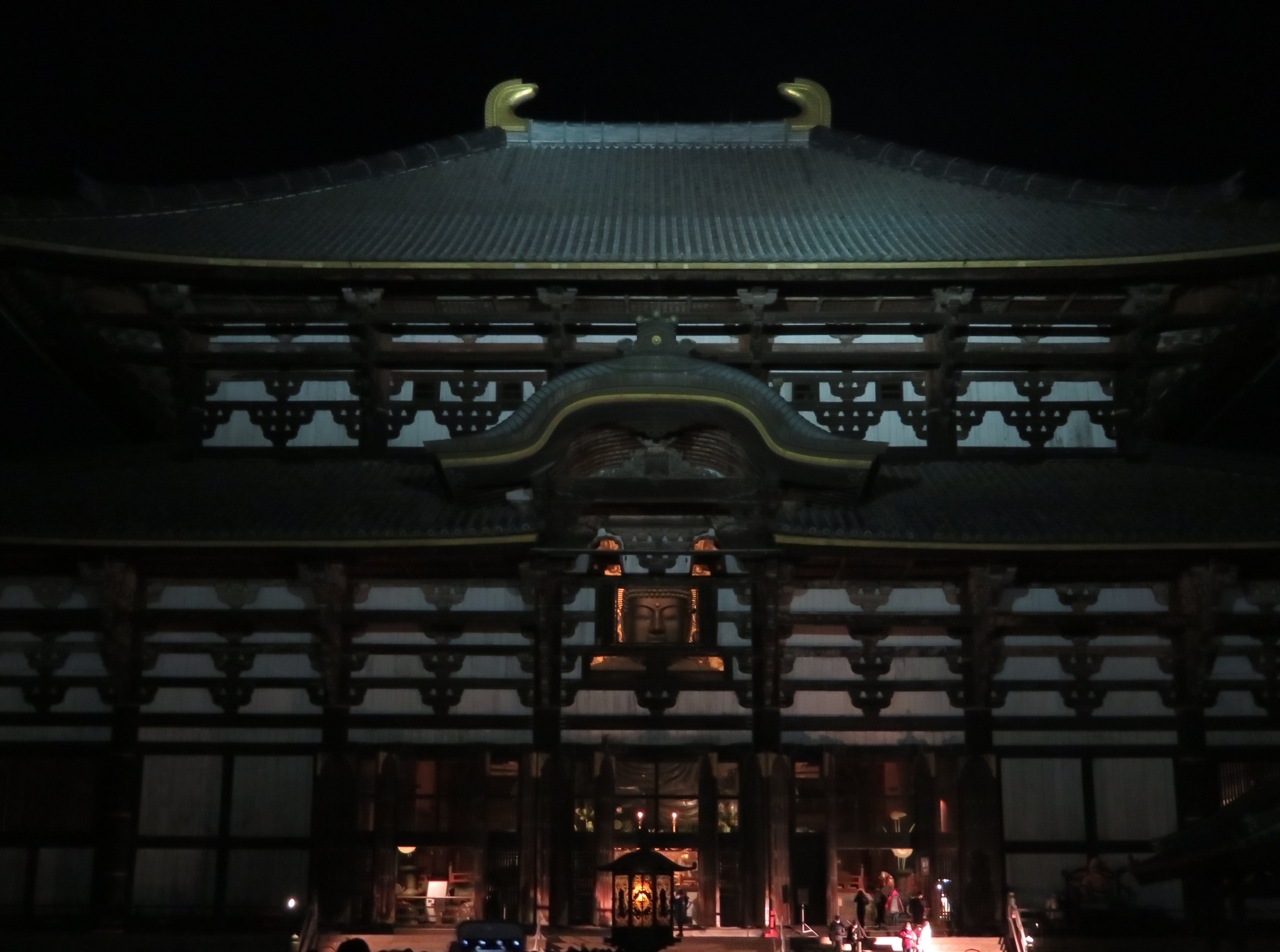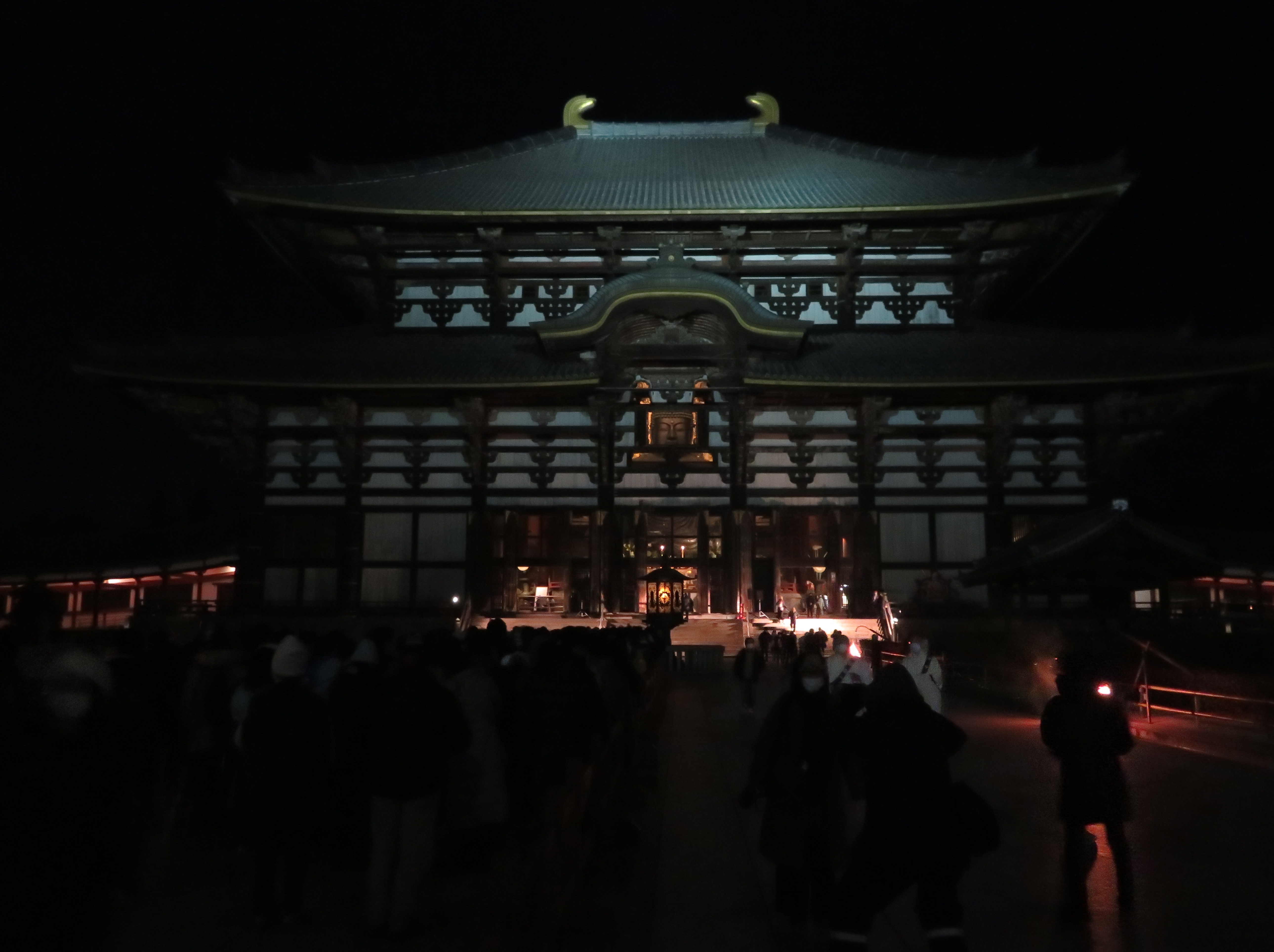 | 年に数回しか開かれない観相窓から、大仏さんの初詣をしたいと思って0時過ぎに東大寺に 着きました。コロナ禍で、毎年開かれる中門からは入れませんでした。大仏殿は入場制限をし ていたので、列は全然進まず、後ろからは人は増えてくるので大仏殿に入るのは諦めました。 |