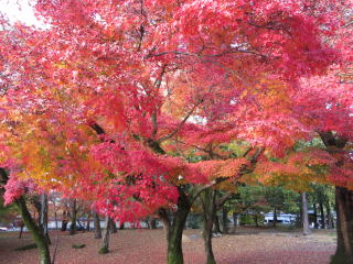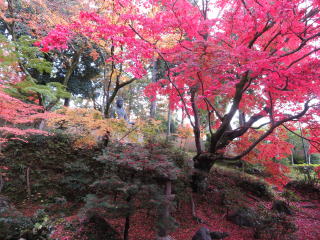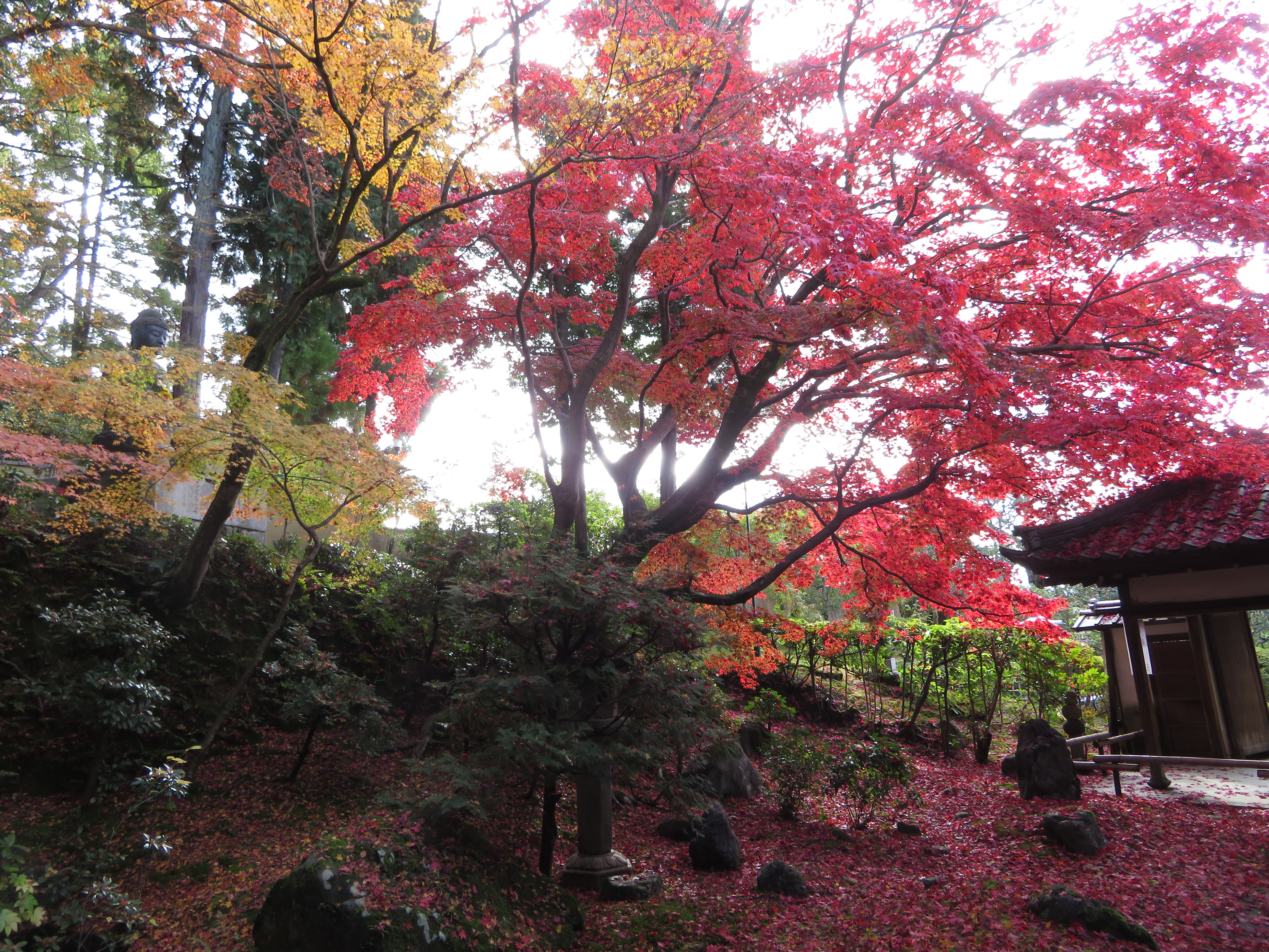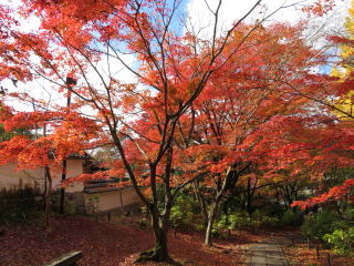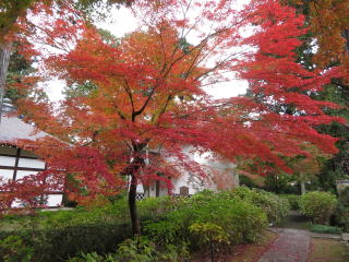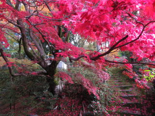 | 驚くほど赤いモミジは真盛りで、太陽の光で輝いていました。 時期はズレますが、裏庭の楓の大木が盛りの時も見事です。 |