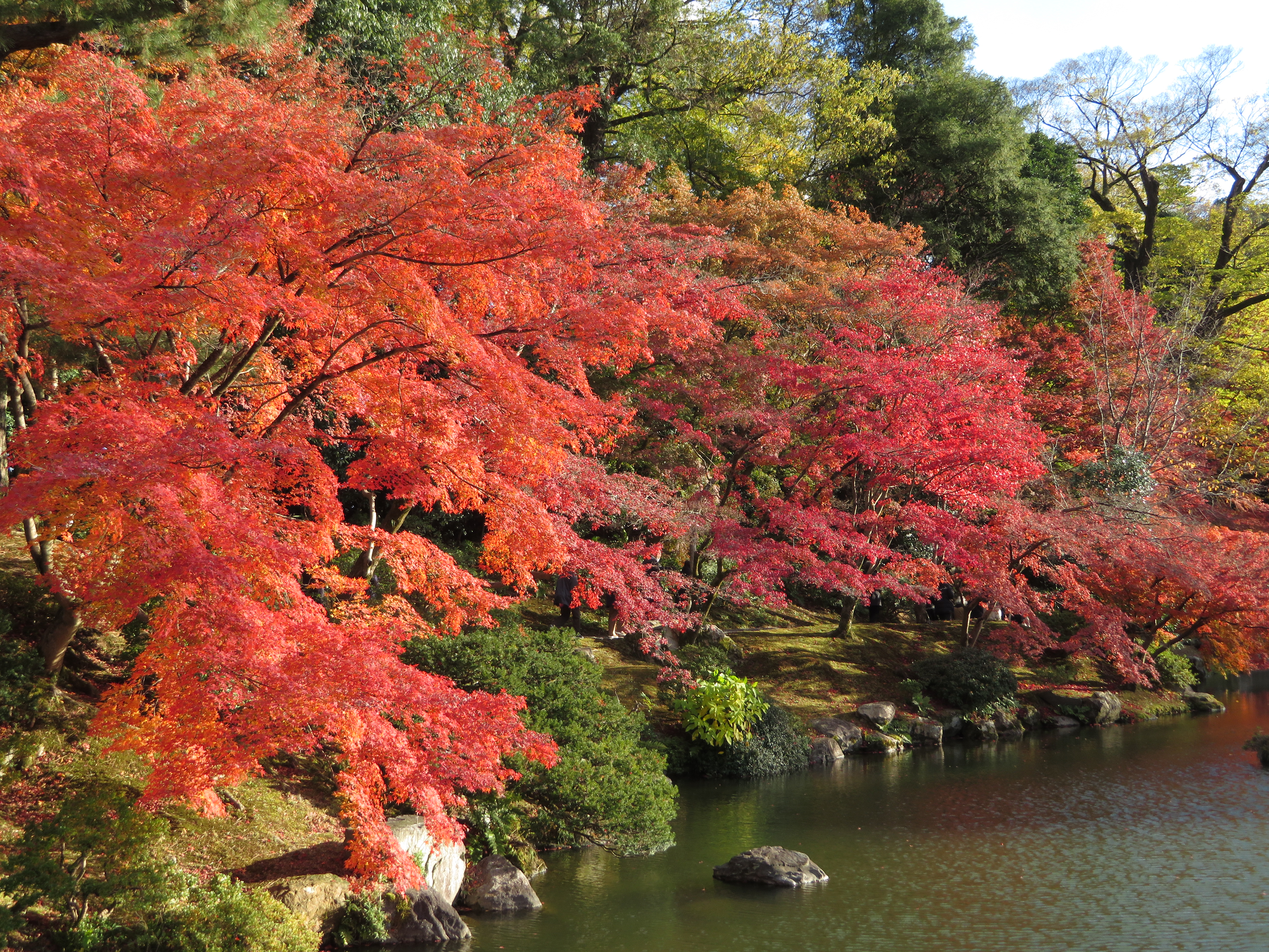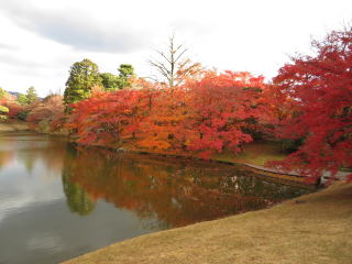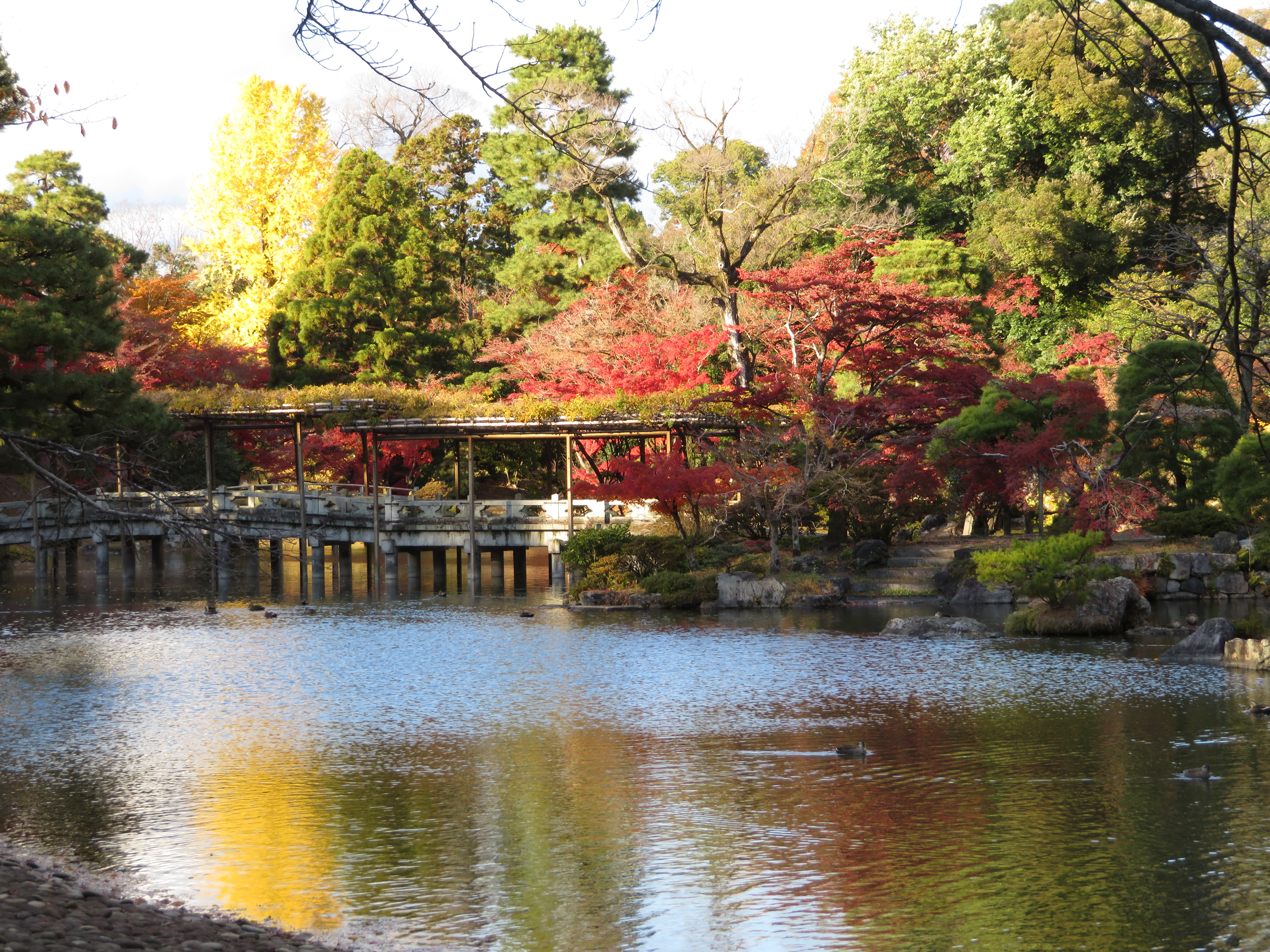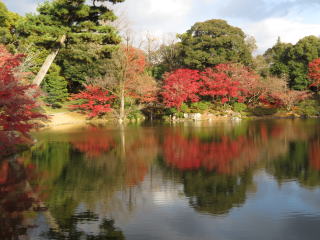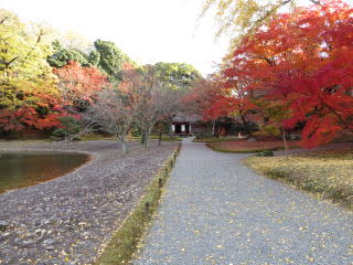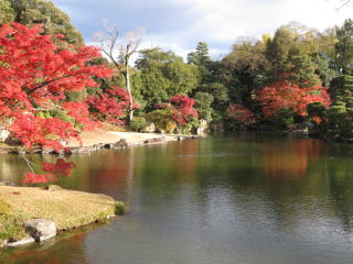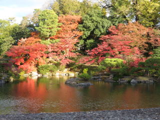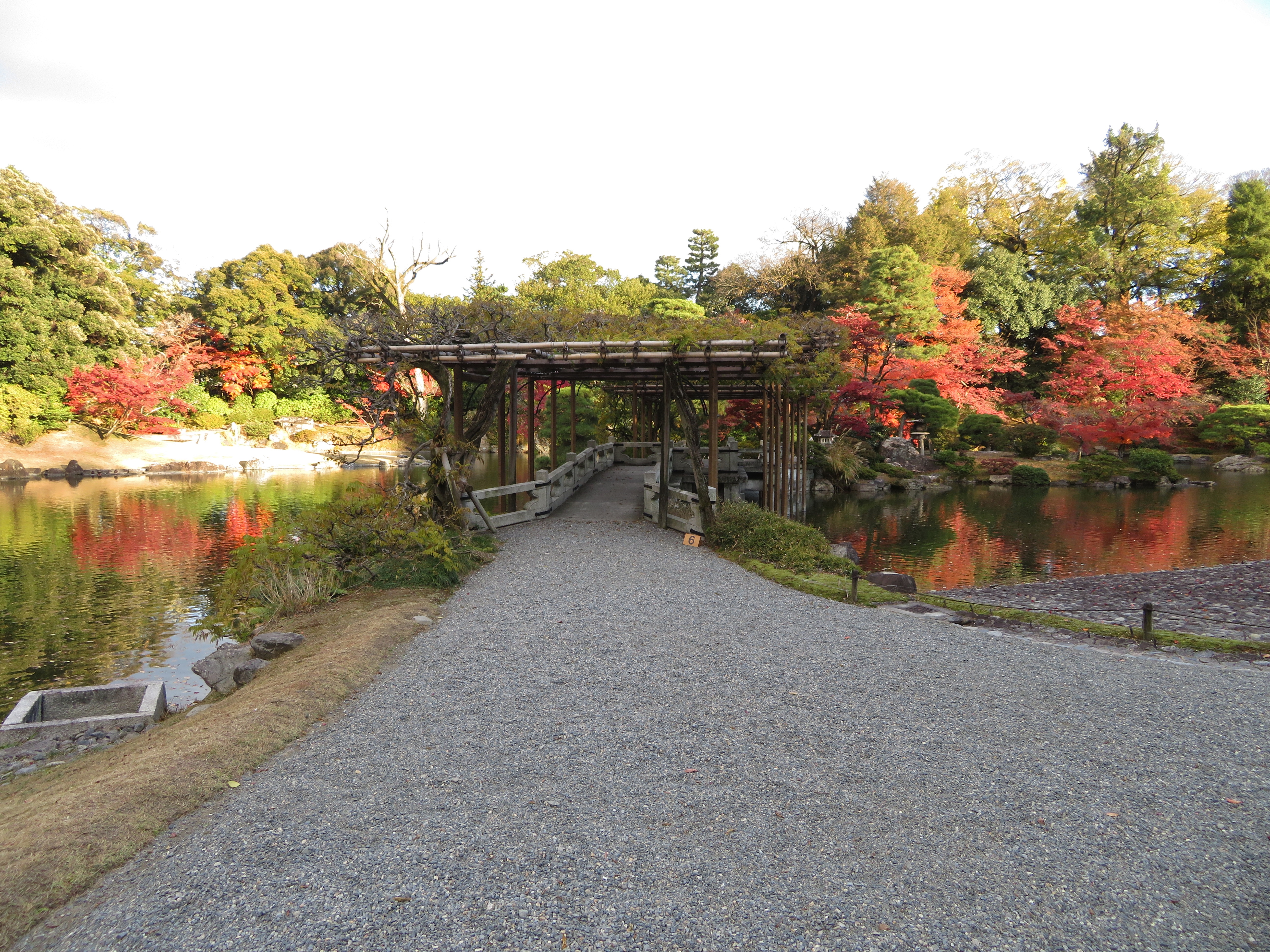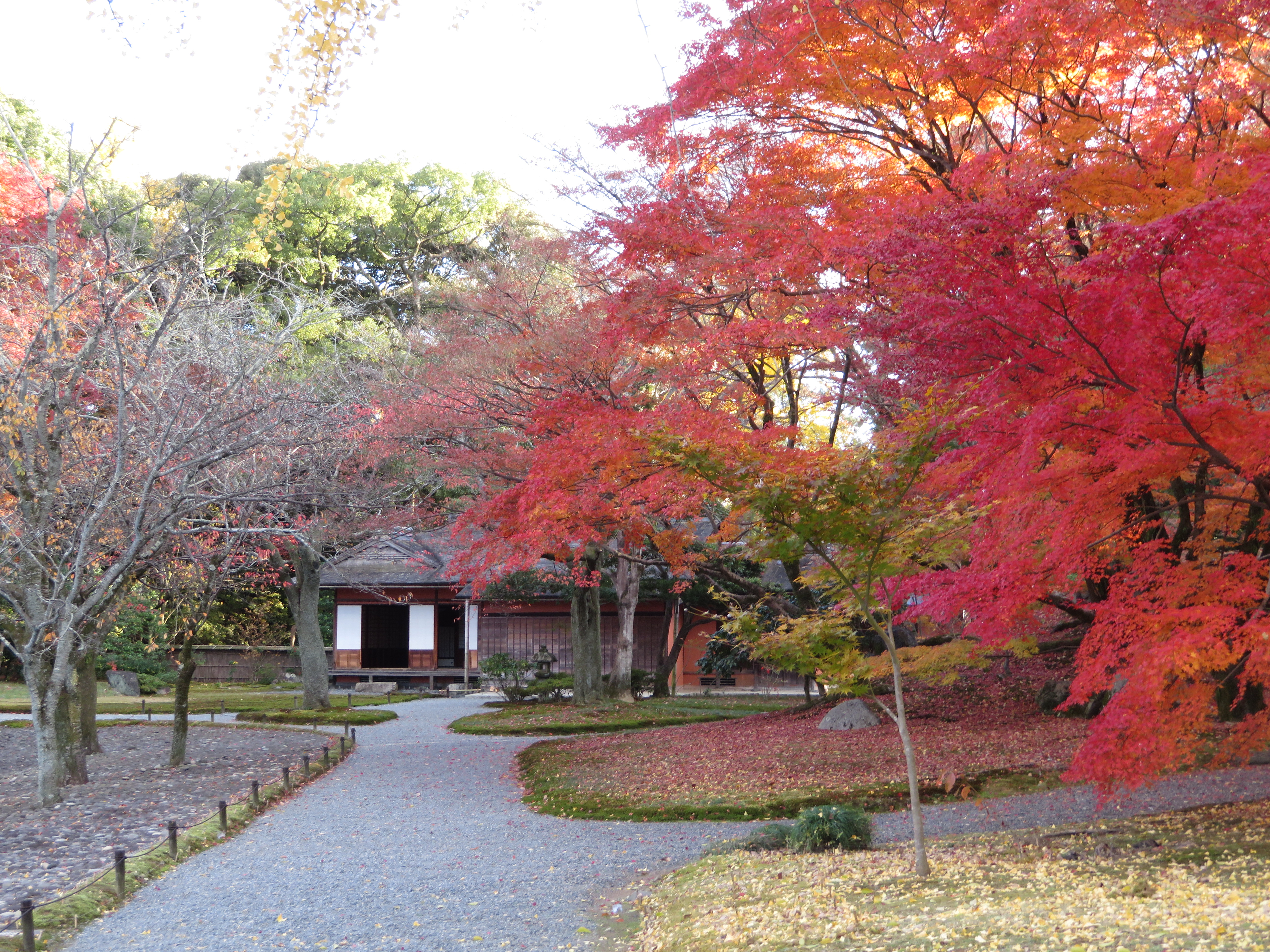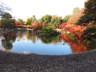 | 前日に思い立って仙洞御所の当日受付に行きました。紅葉の時期はダメかなと思って いましたが、12月に入って観光客が減ったのか予想外に簡単に取れました。 2011年に訪れた時は、まだ予約制だけだったので希望する日が取れず、 予約出来た日は紅葉には大分早かったのですが、今回は紅葉真盛りの最高の時期 でした。宮内庁が管理する桂離宮・修学院離宮・仙洞御所の中で、紅葉は仙洞御所 が断トツに綺麗です。 |