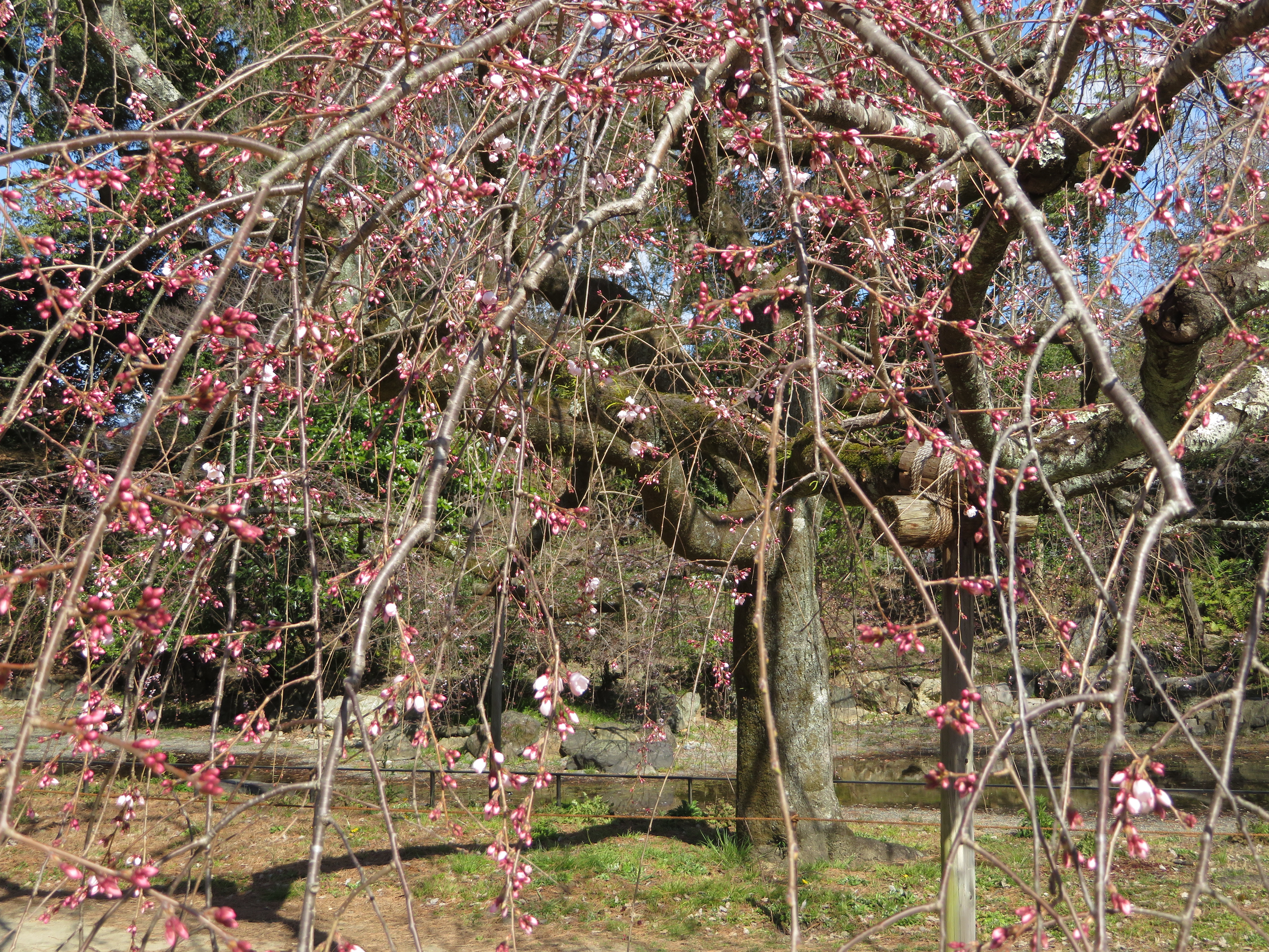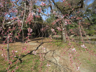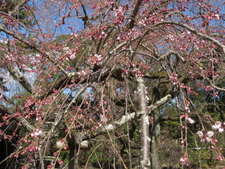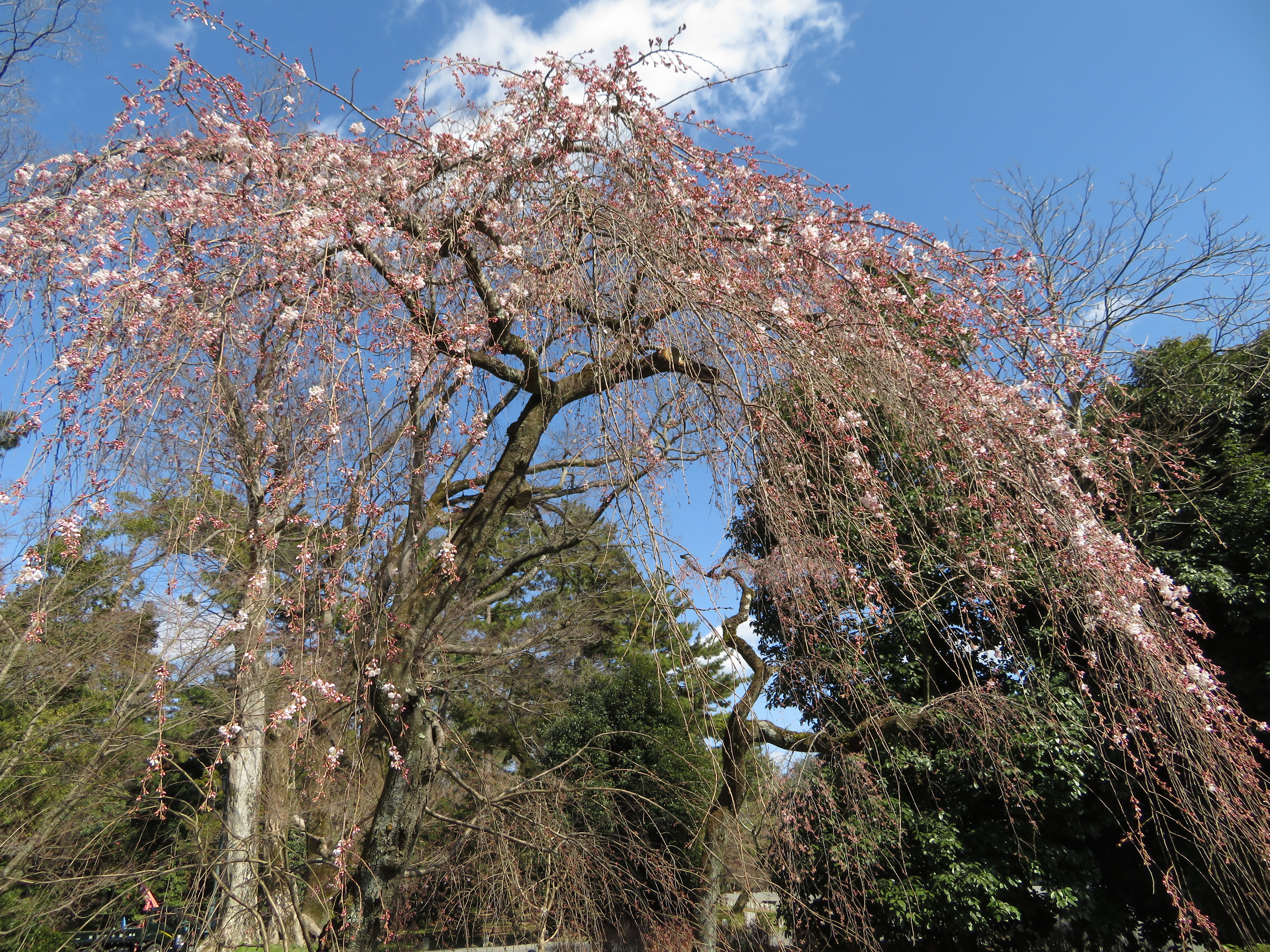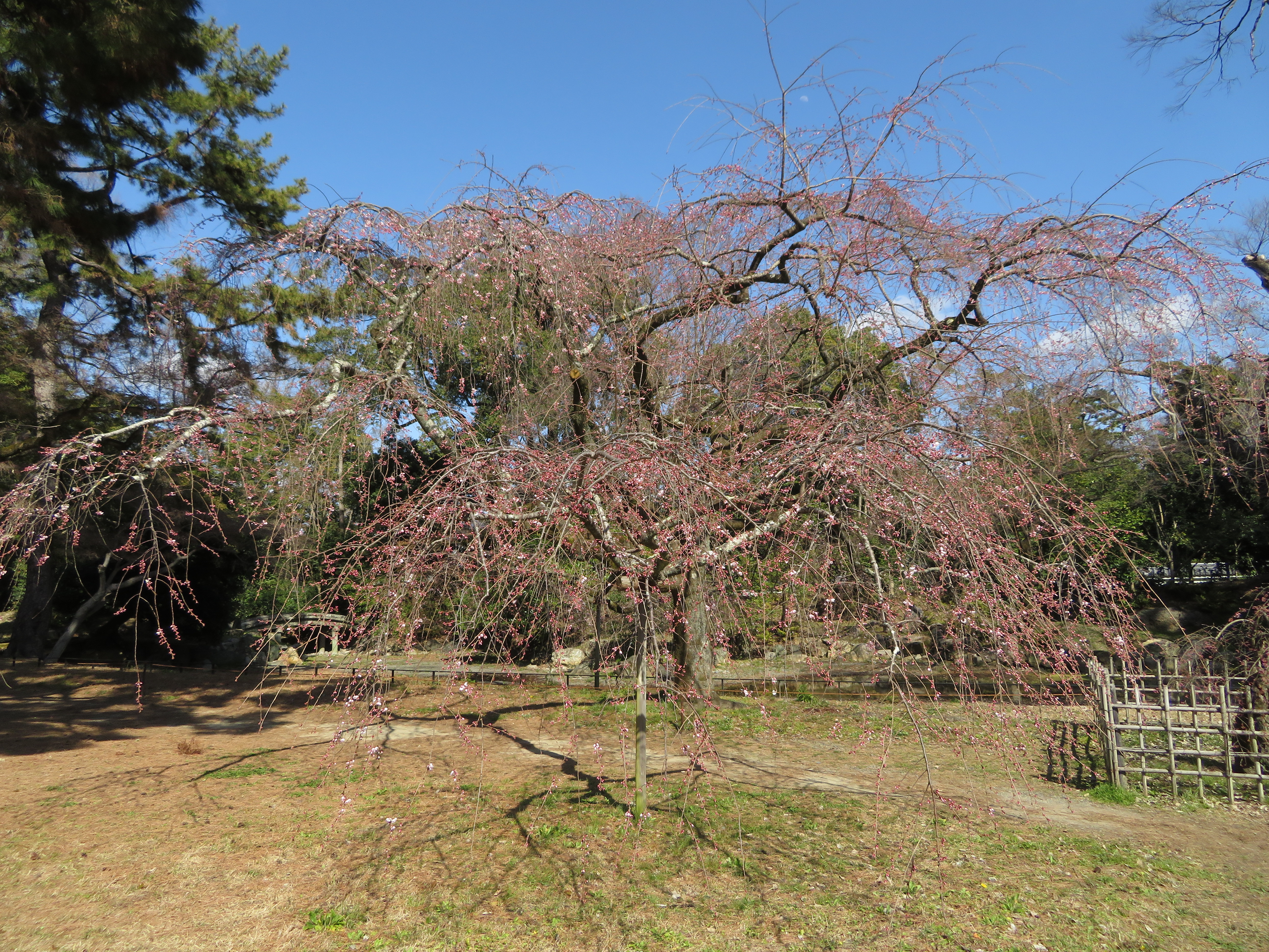| 近衛邸跡の枝垂桜は咲き始めでしたが、すぐに見頃になってたくさんの人が訪れます。 |