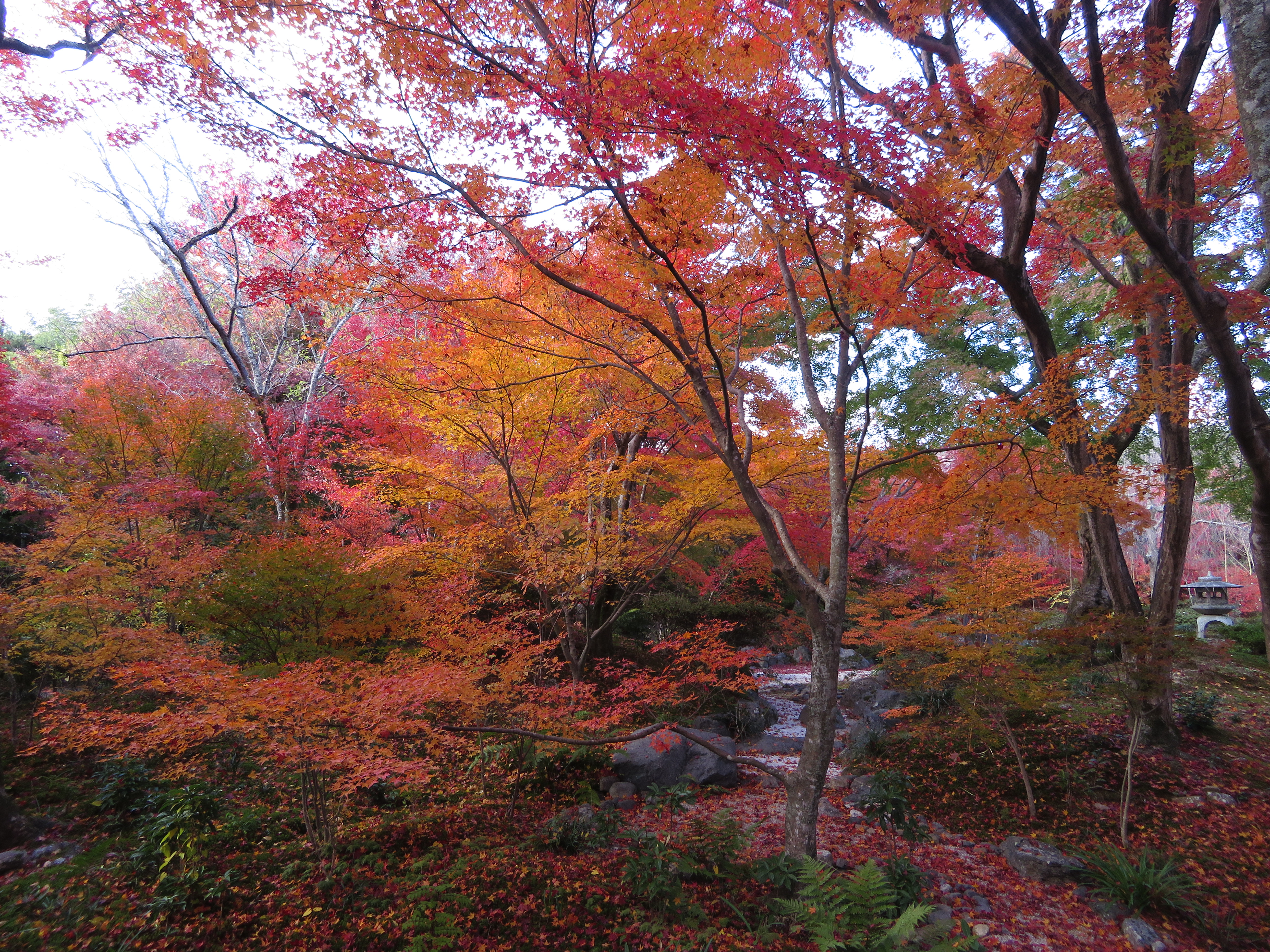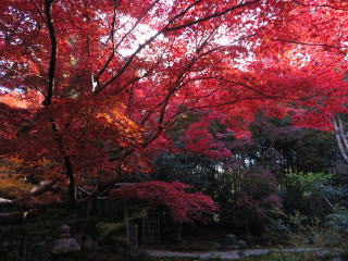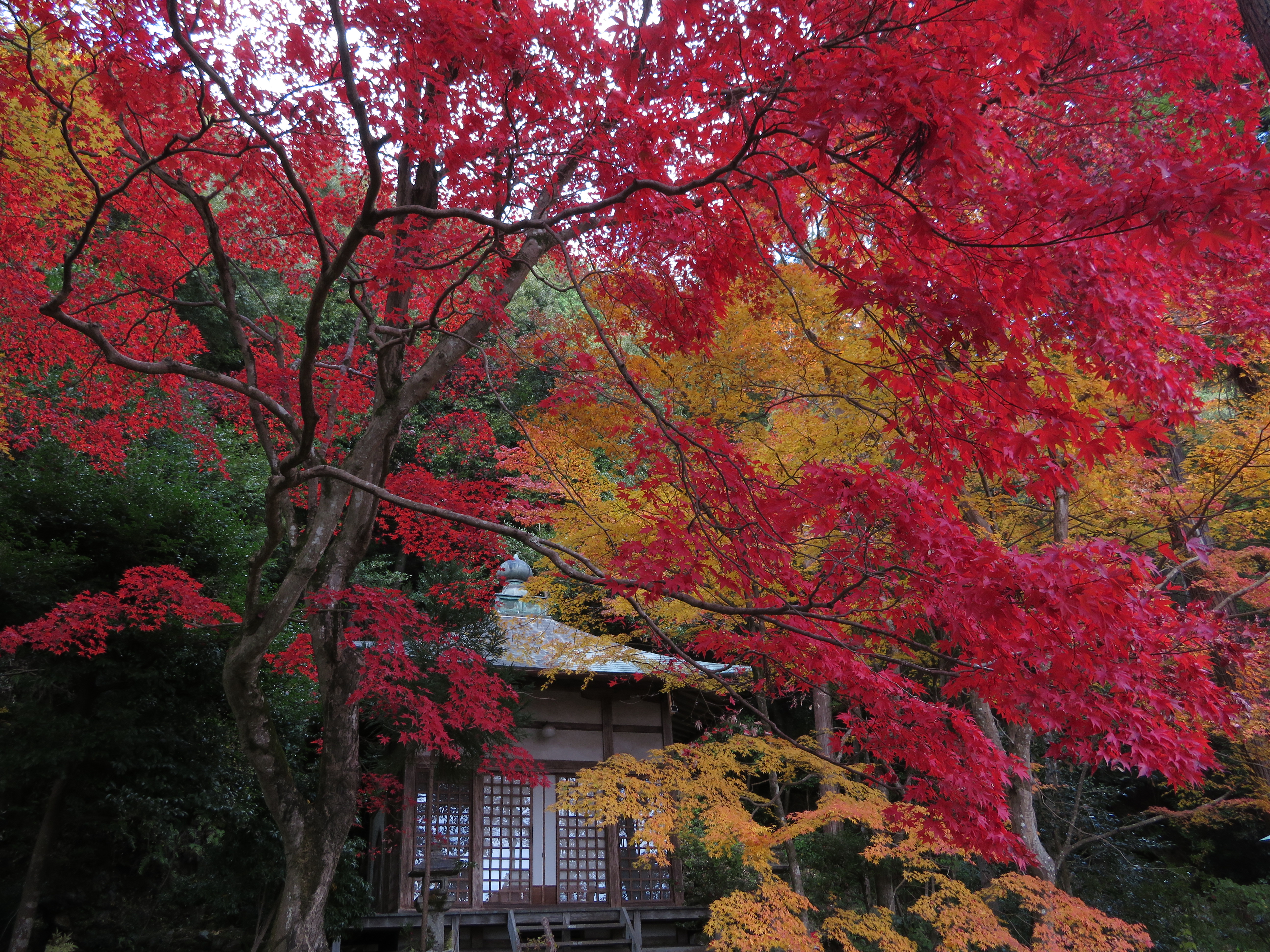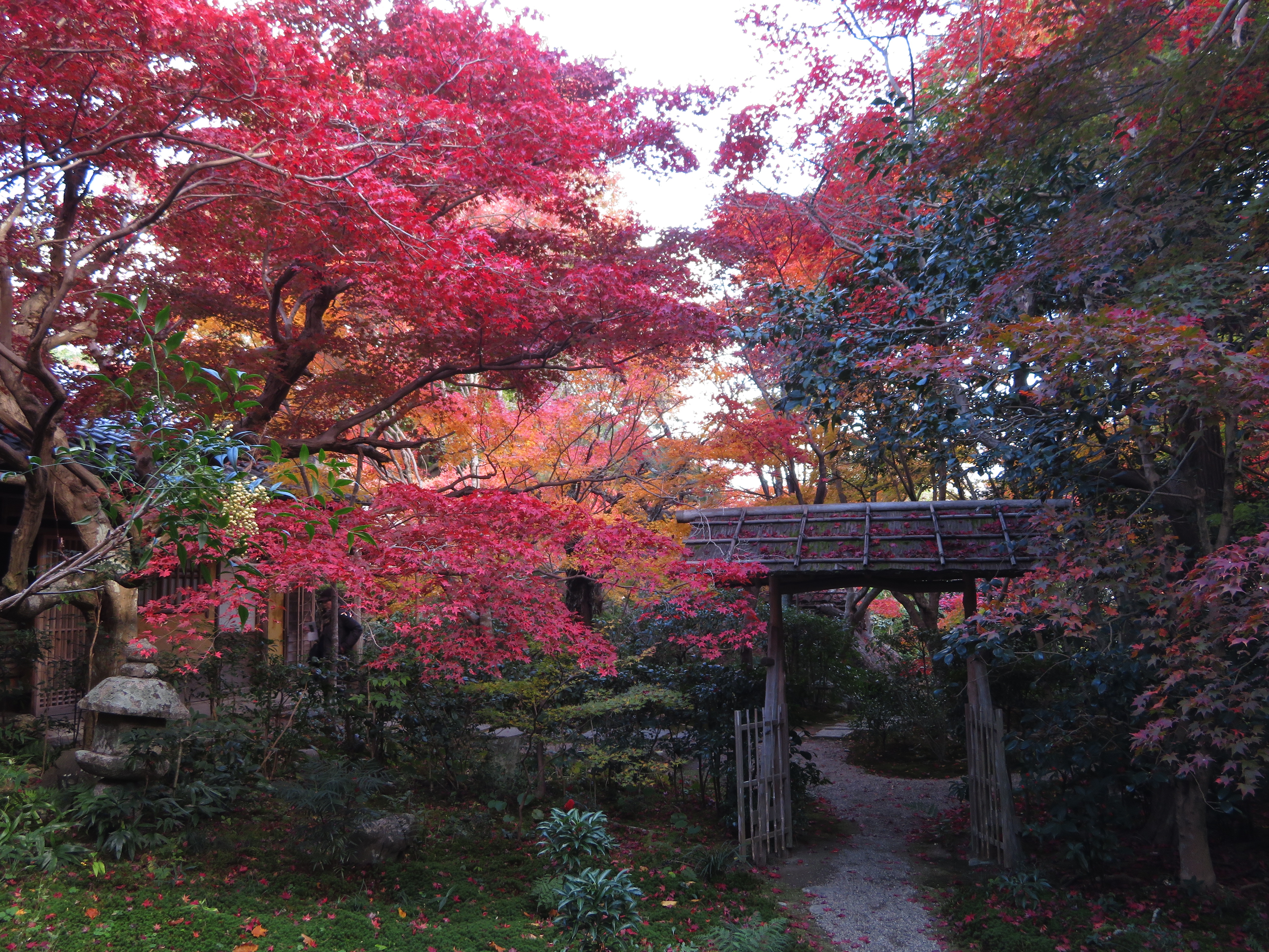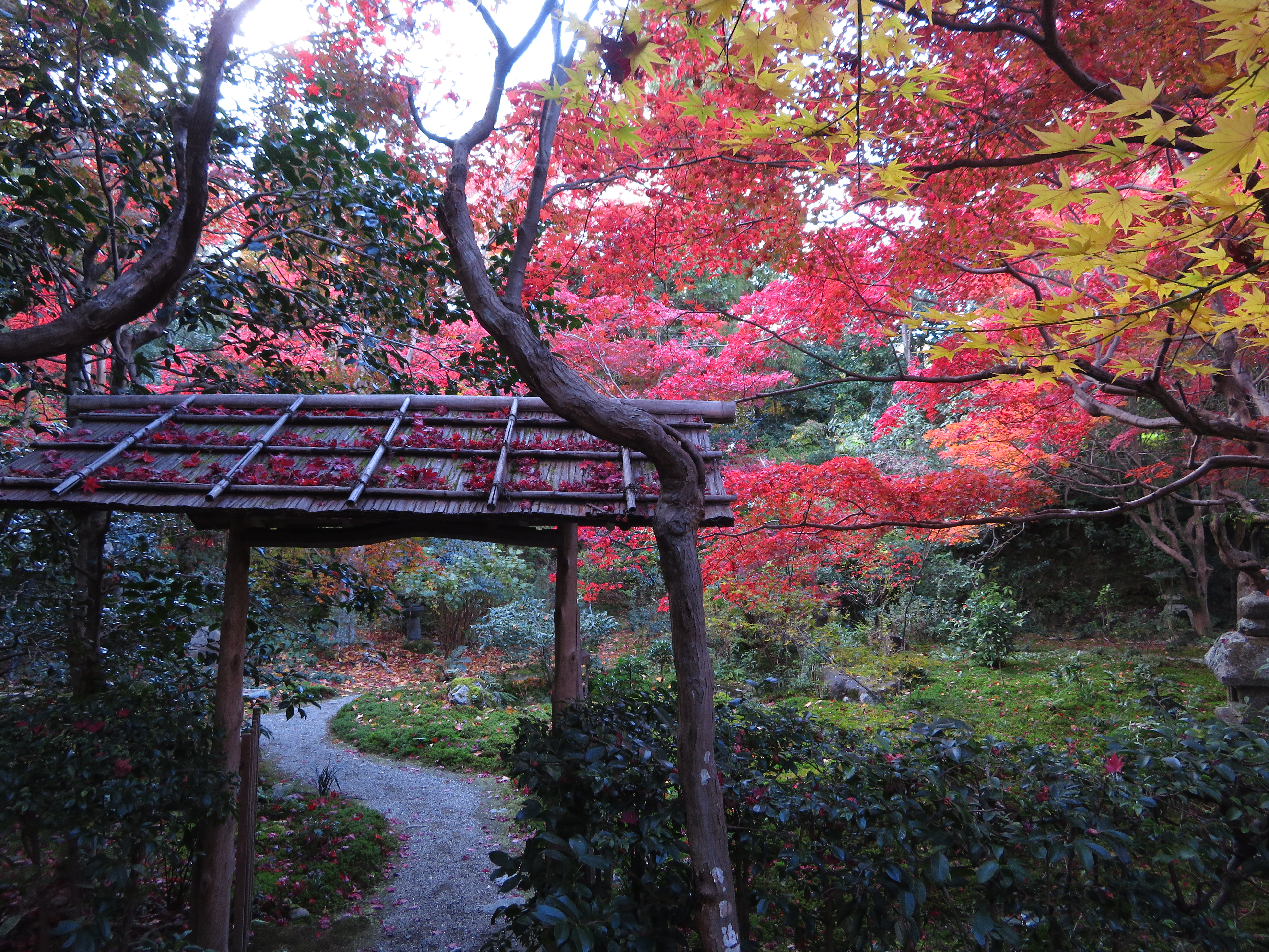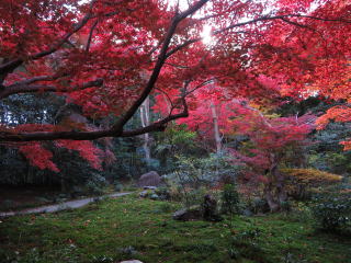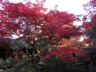 | 狭い路地(ろおじ)の突き当りにある本当に小さいお寺ですが、紅葉の巨木が一本 真っ赤に色付いて存在感を示しています。嵯峨野の紅葉を見に来る時は、必ず 立ち寄る好きなお寺です。 |