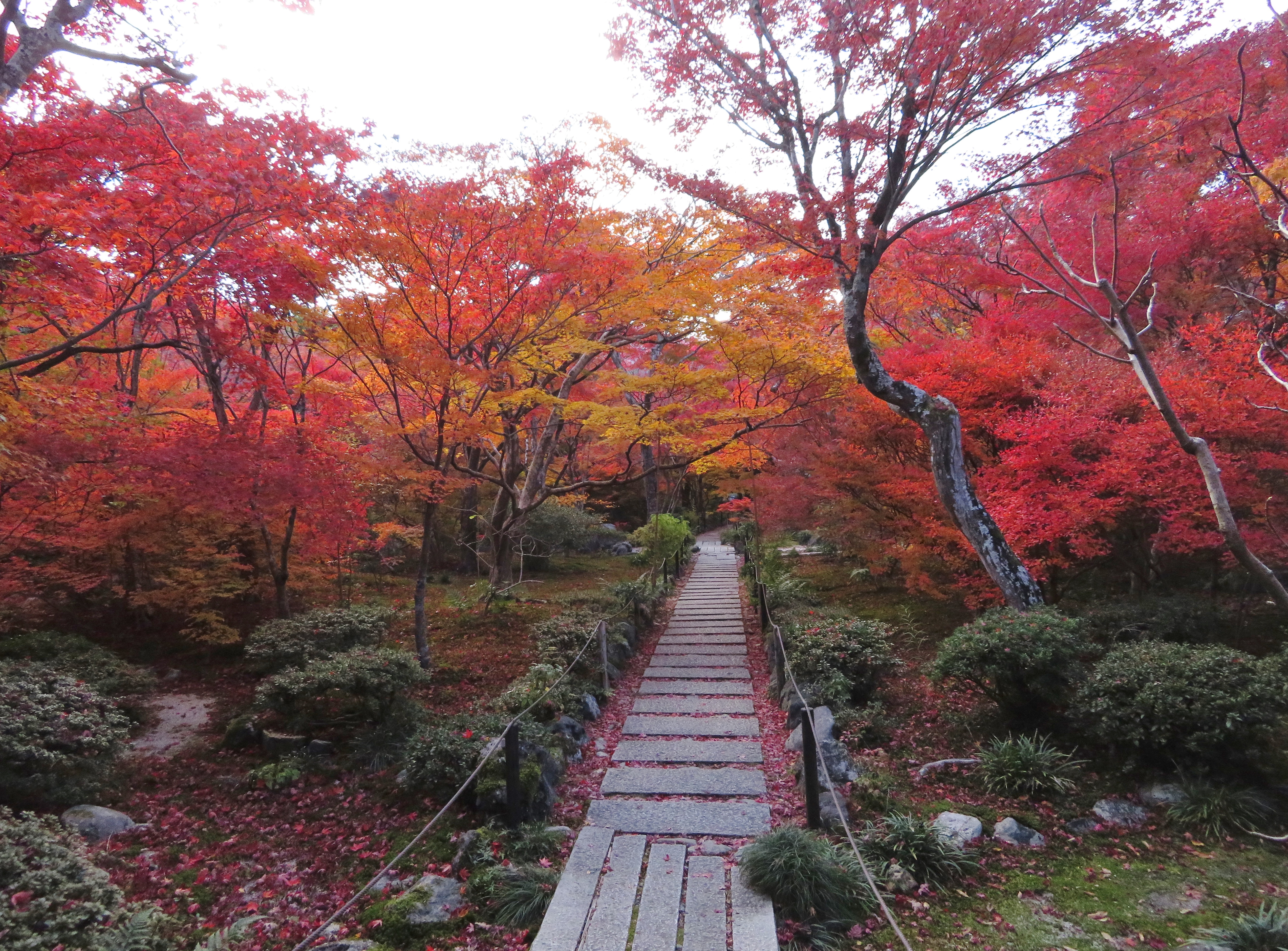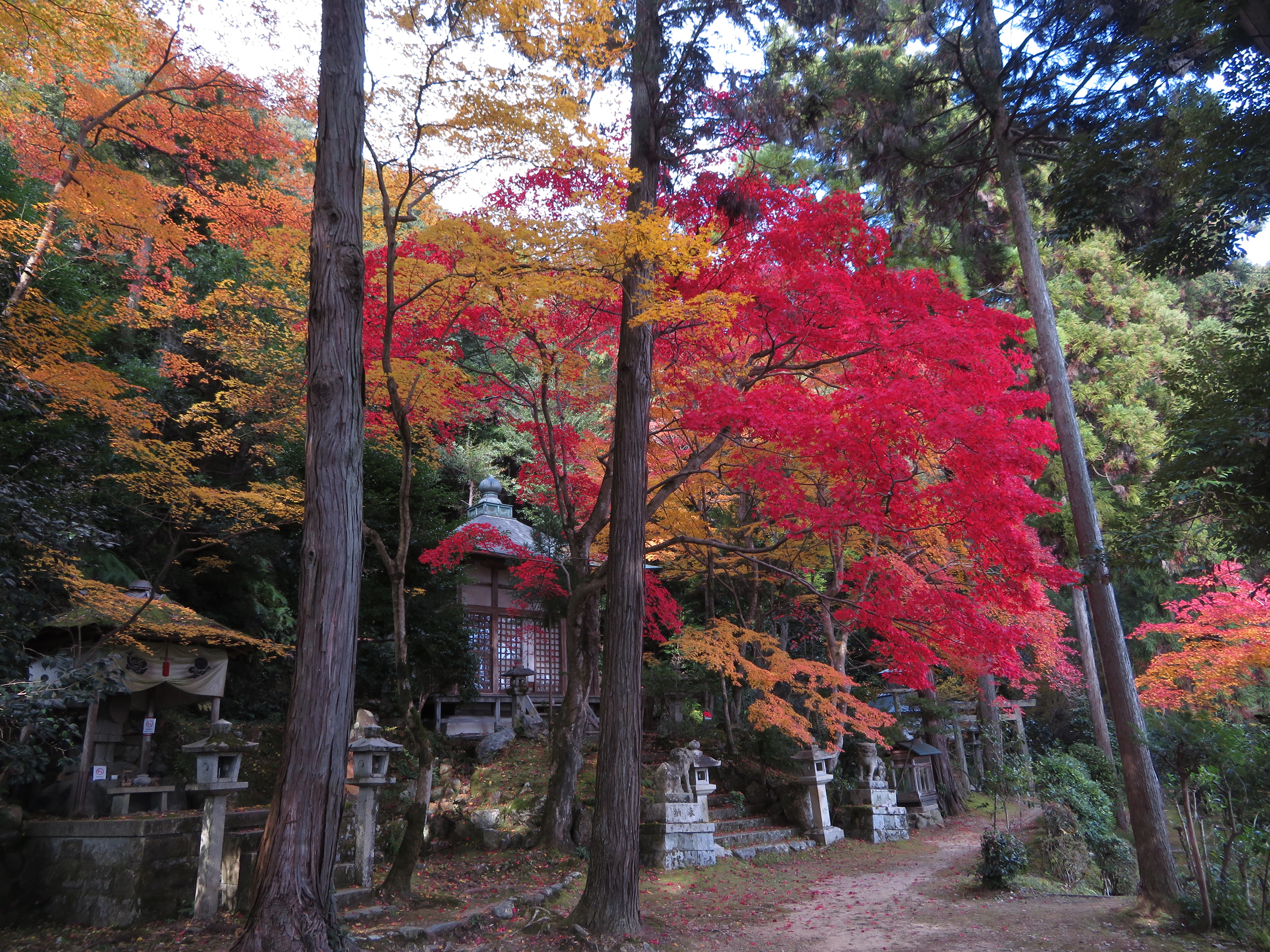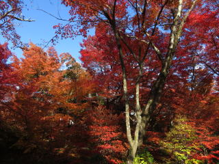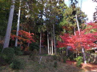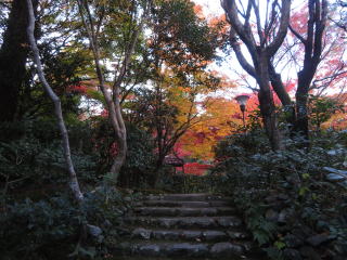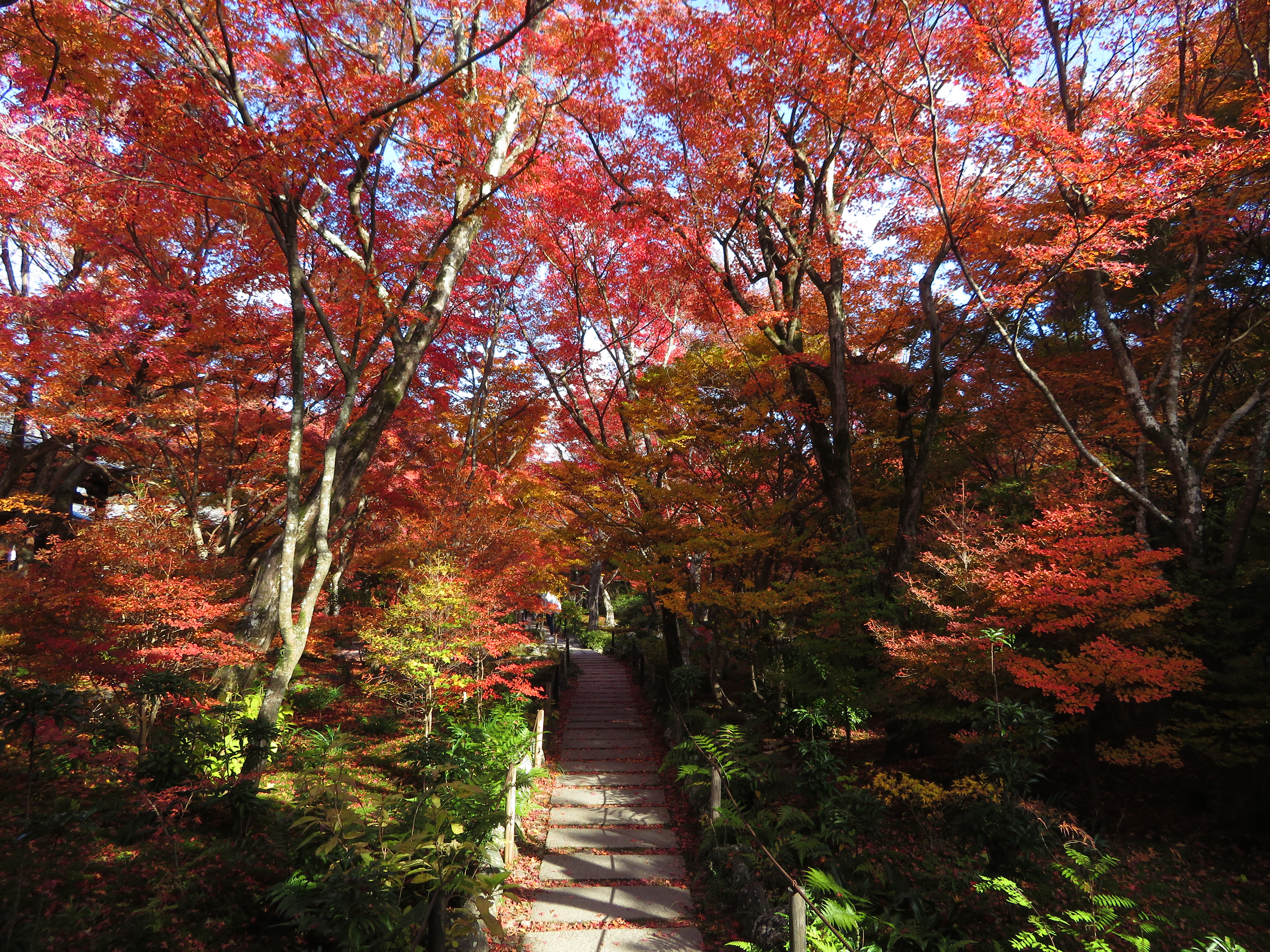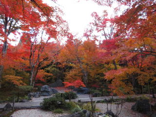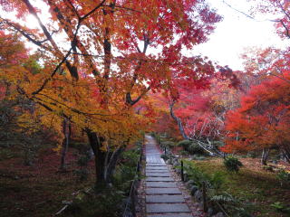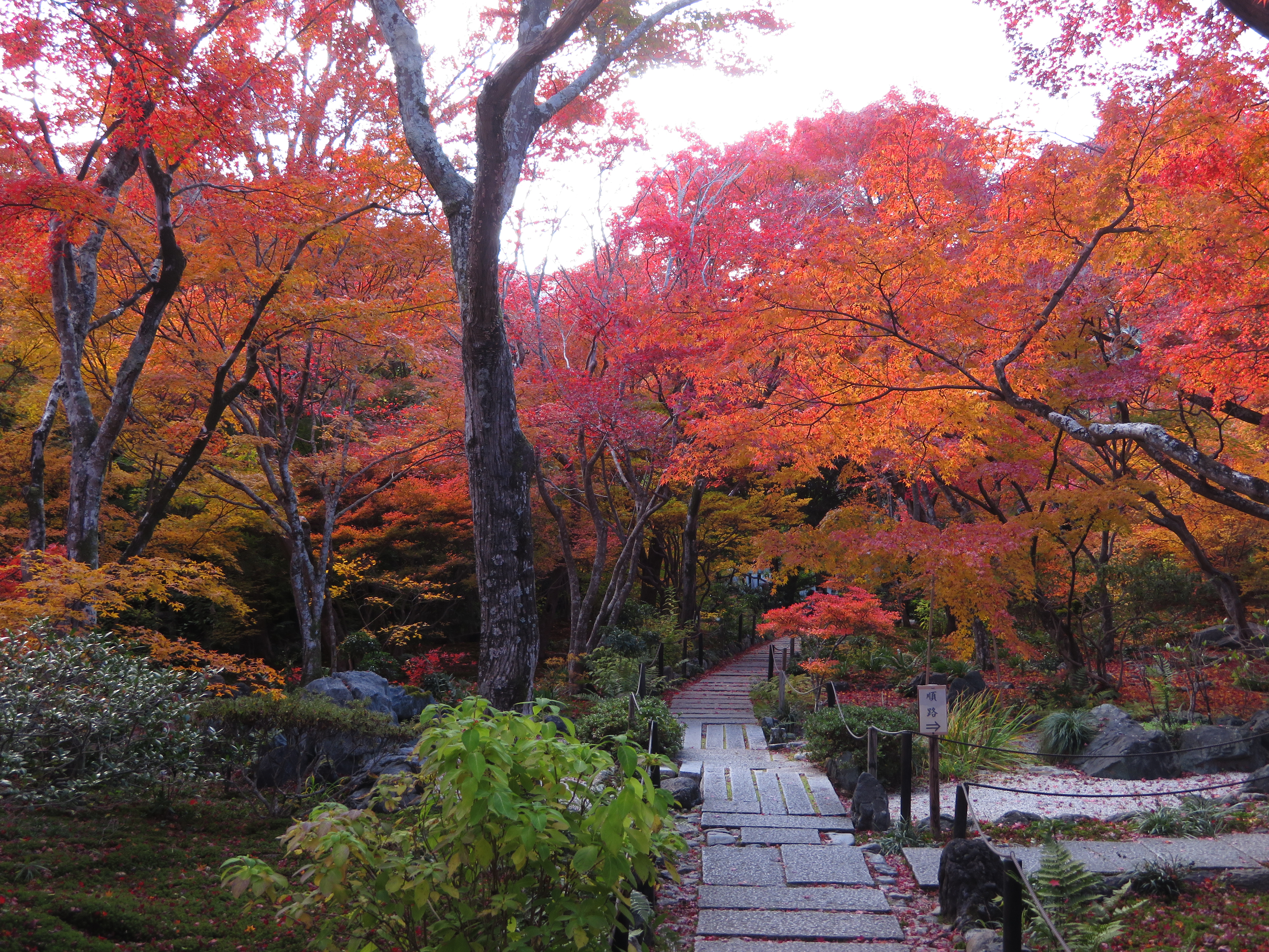 | 狭い路地(ろおじ)の突き当りにある本当に小さいお寺ですが、紅葉の巨木が一本 真っ赤に色付いて存在感を示しています。嵯峨野の紅葉を見に来る時は、必ず 立ち寄る好きなお寺です。 |