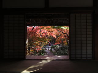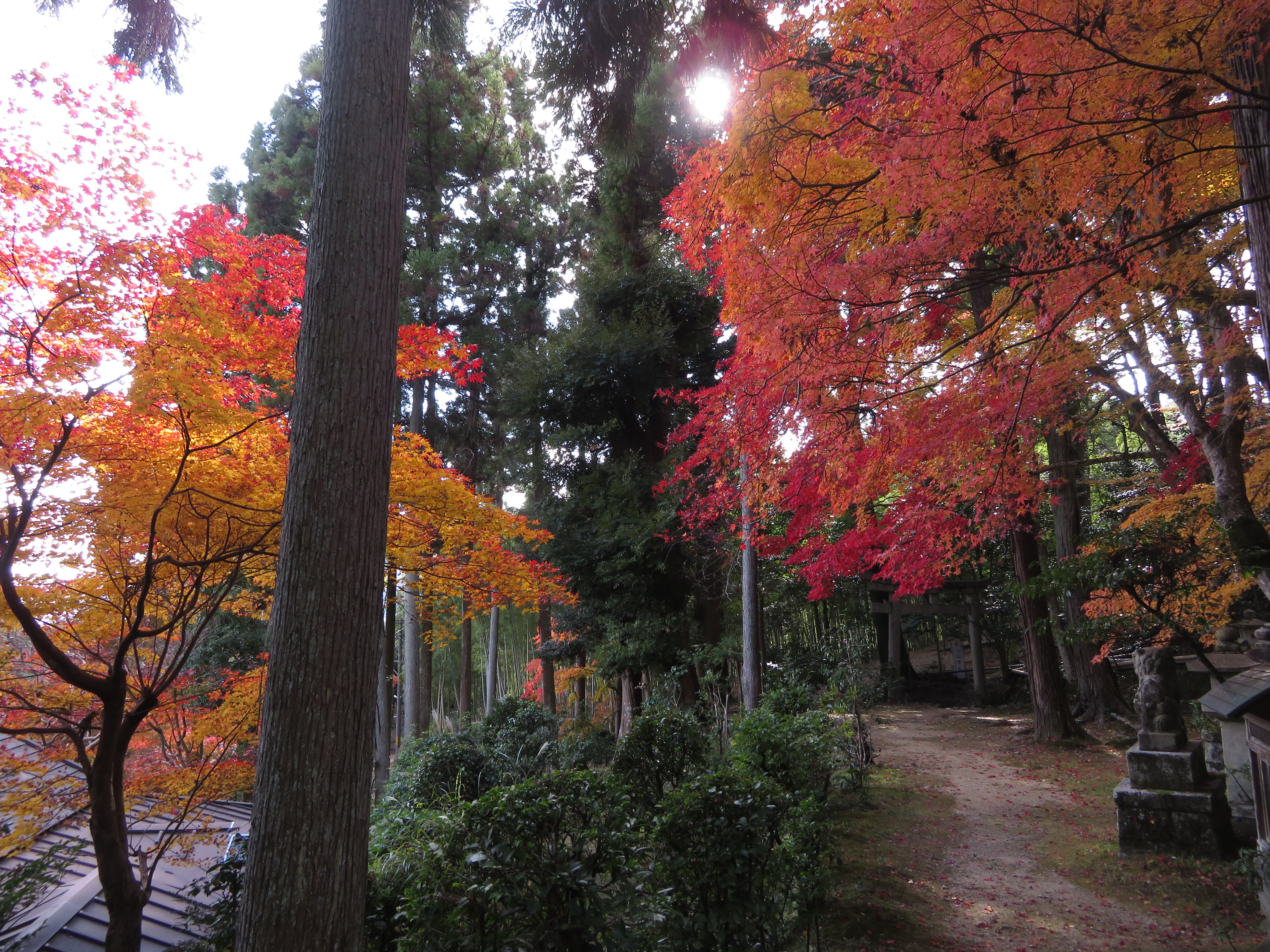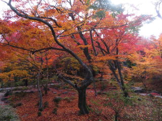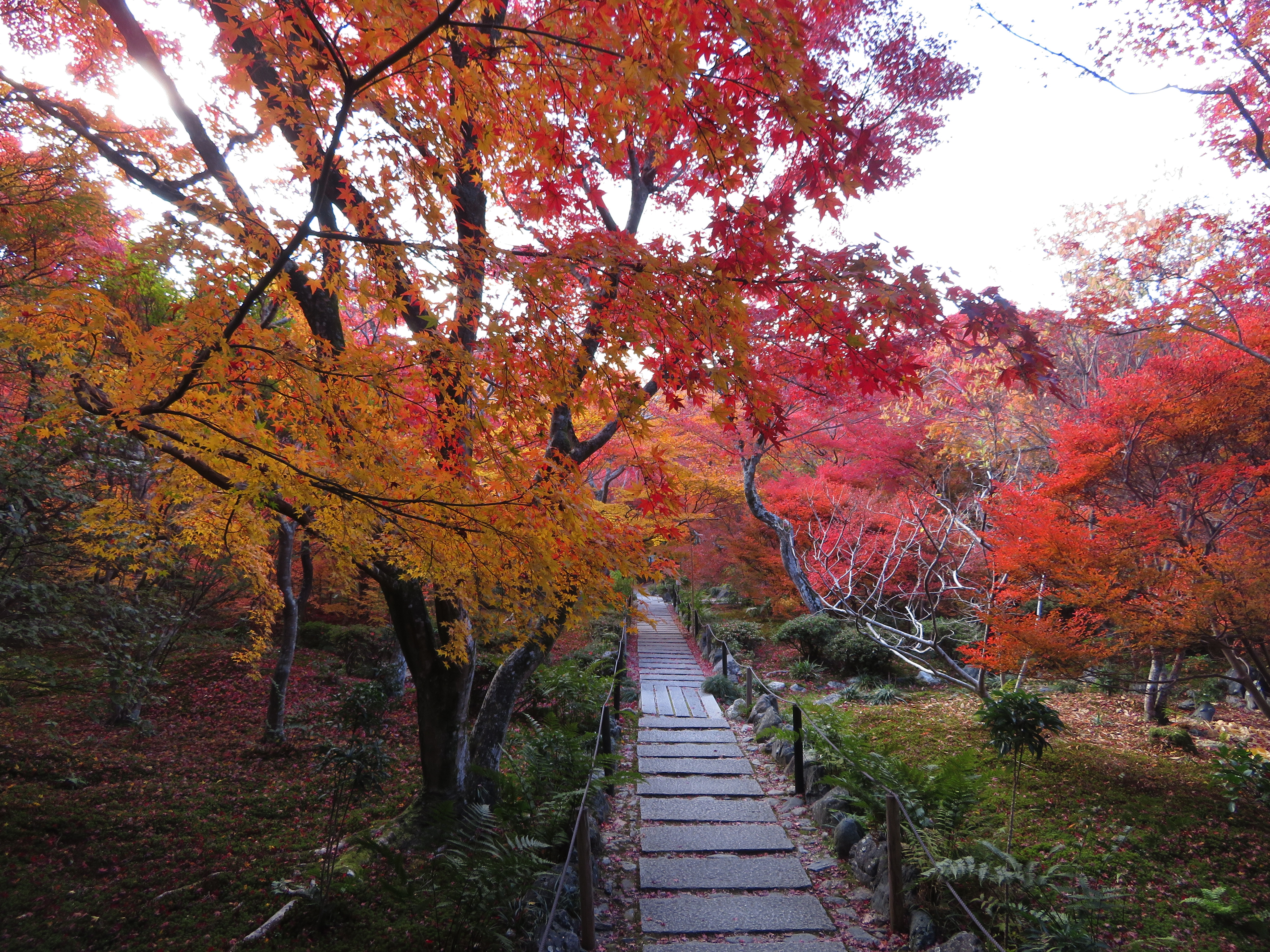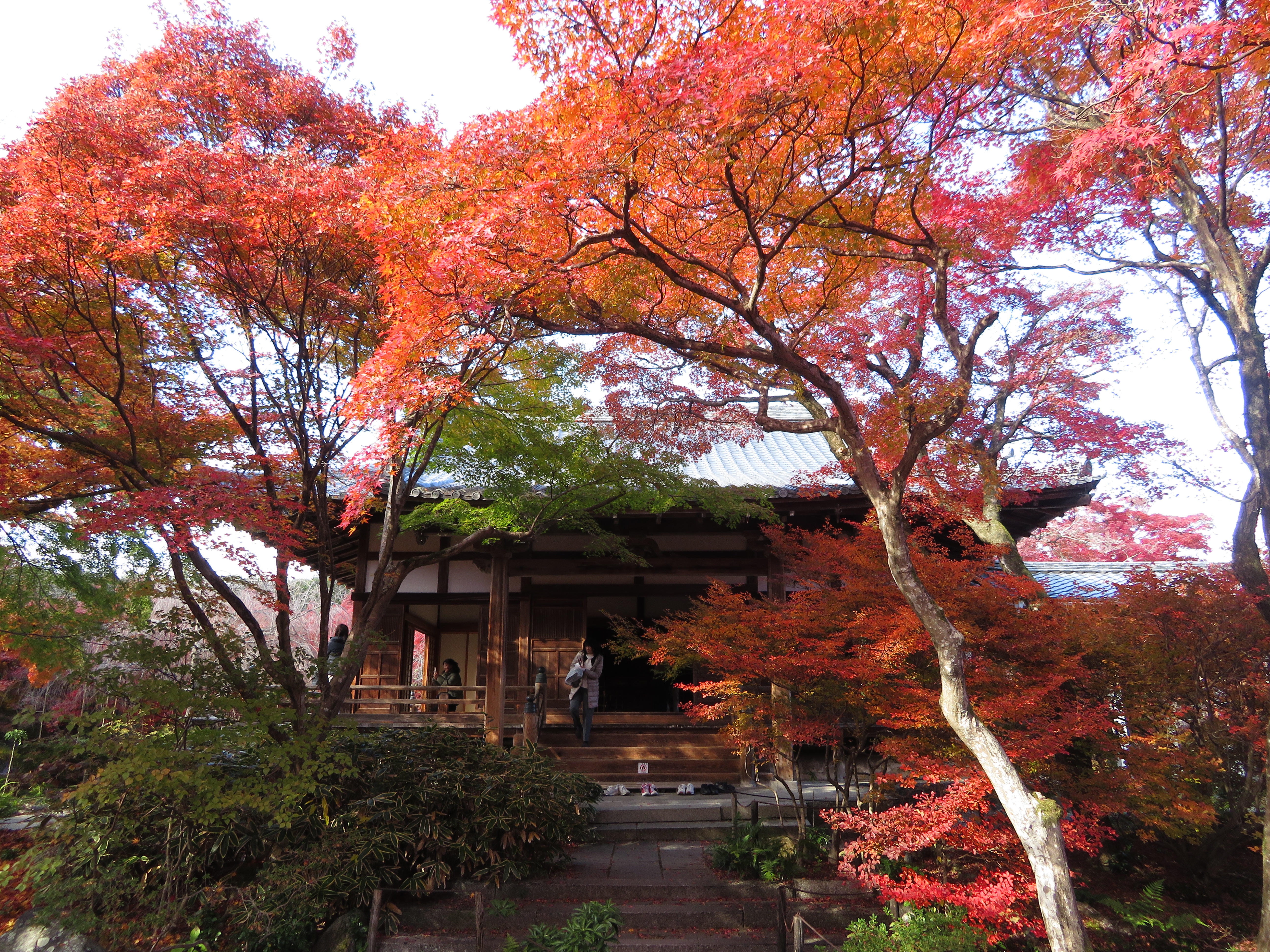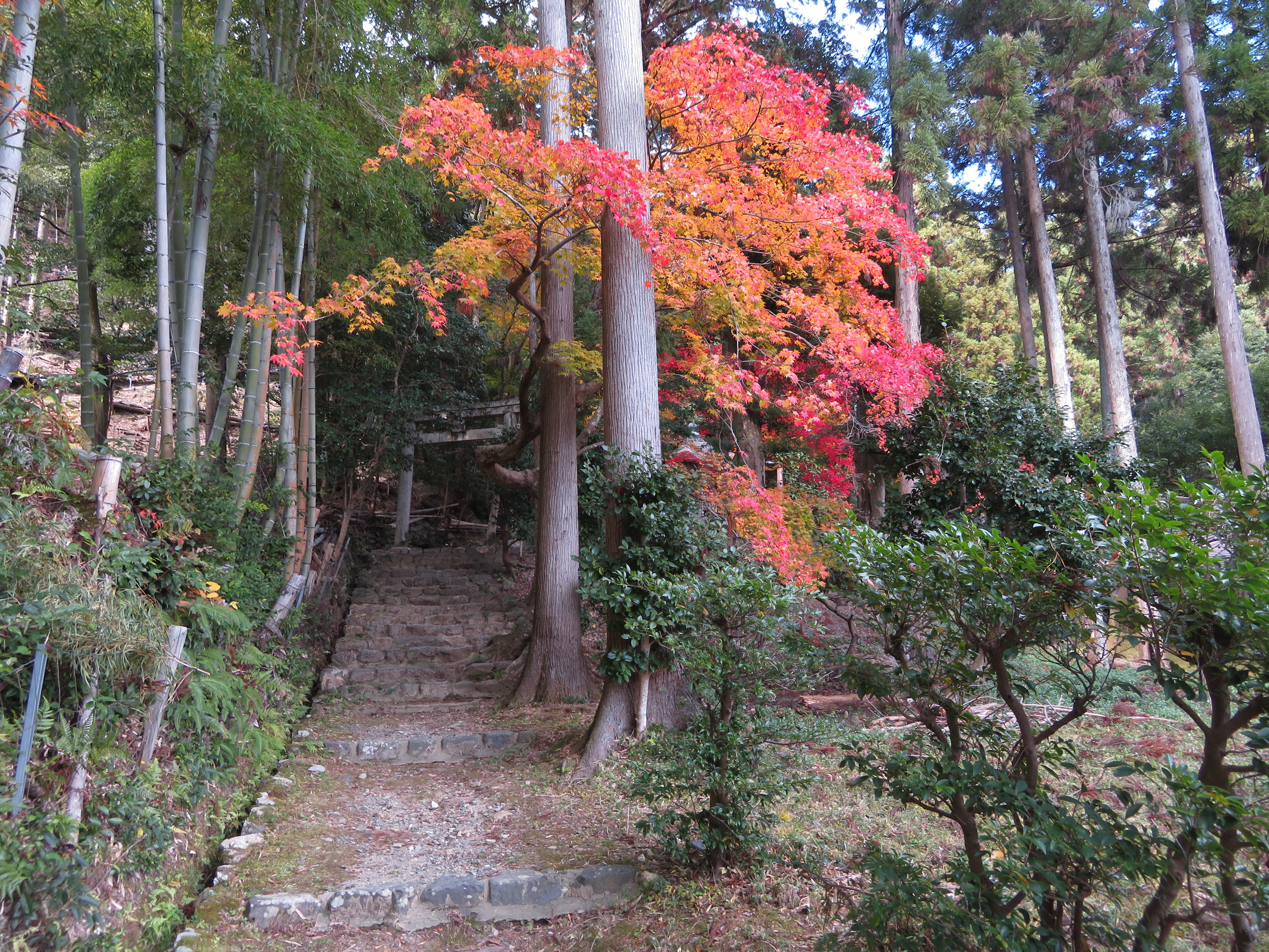 | 狭い路地(ろおじ)の突き当りにある本当に小さいお寺ですが、紅葉の巨木が一本 真っ赤に色付いて存在感を示しています。嵯峨野の紅葉を見に来る時は、必ず 立ち寄る好きなお寺です。 |
