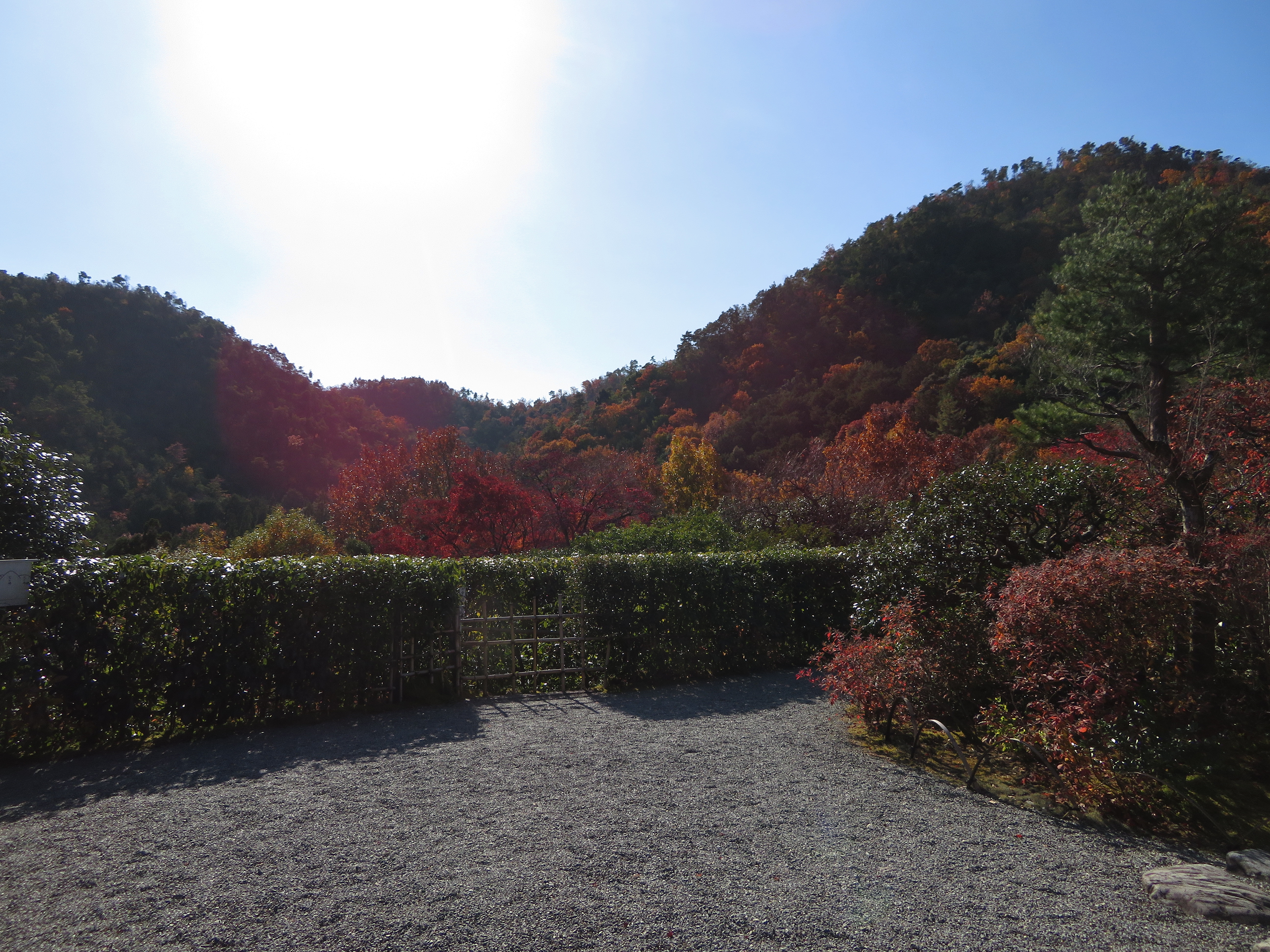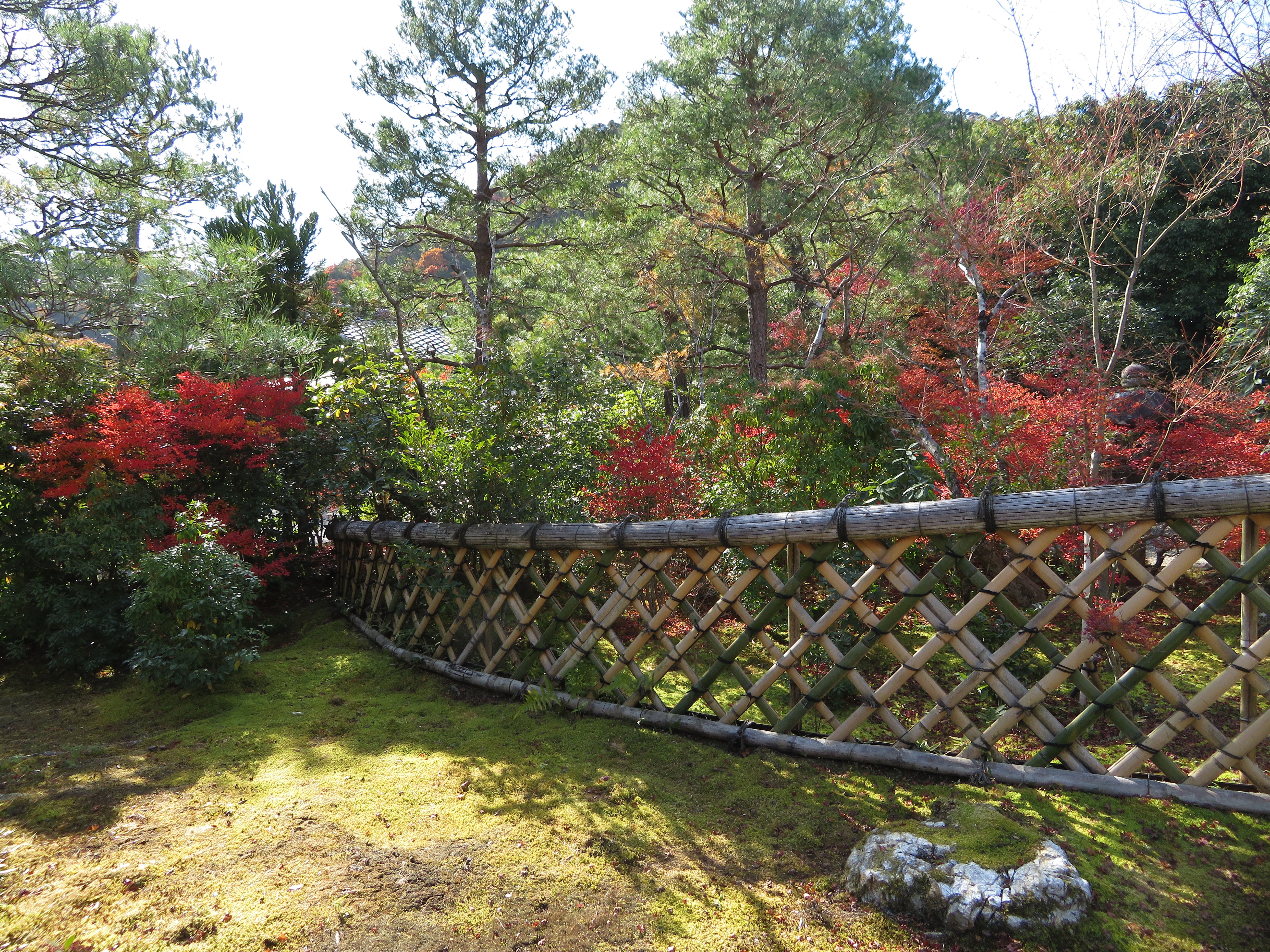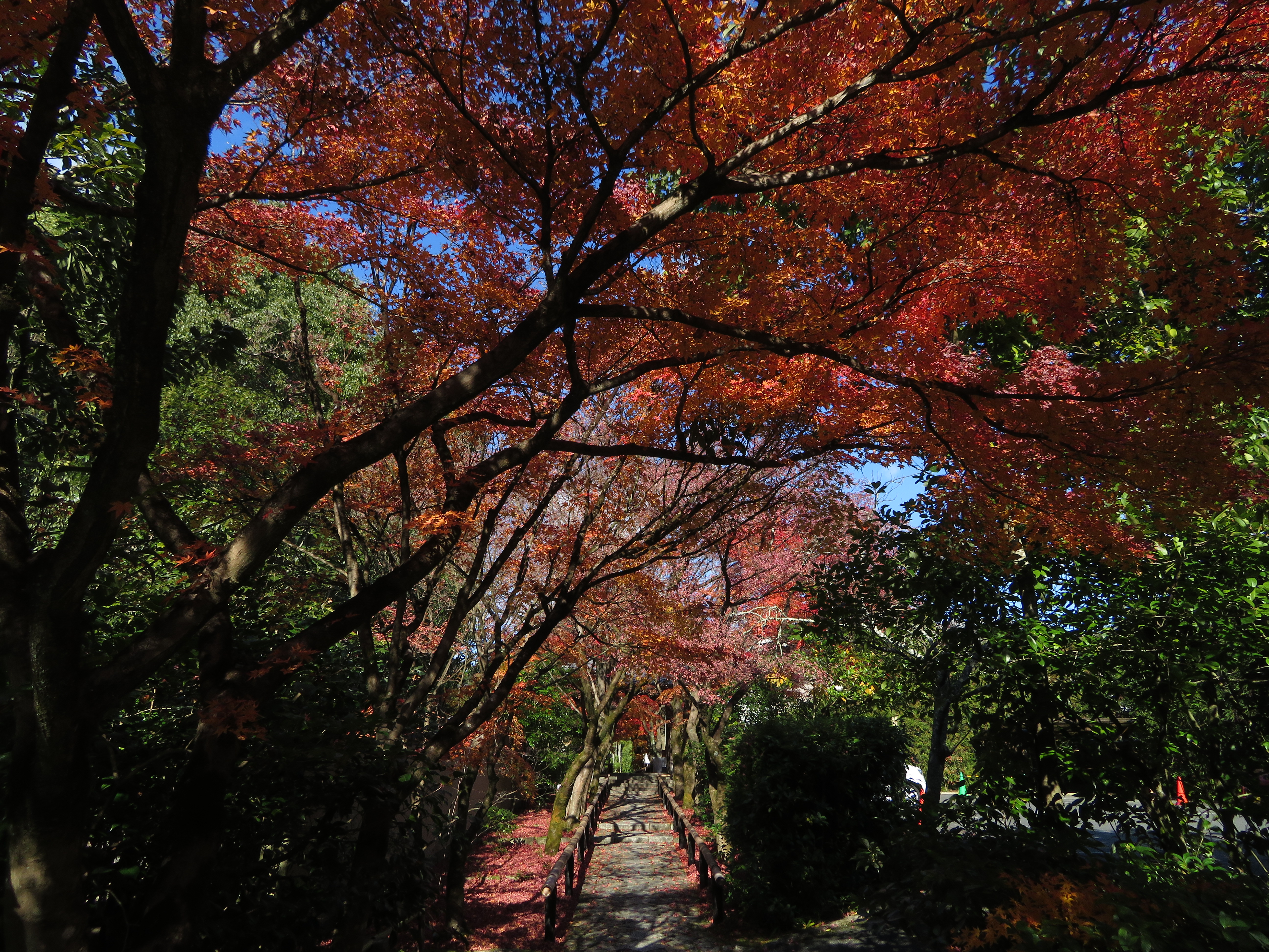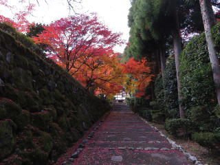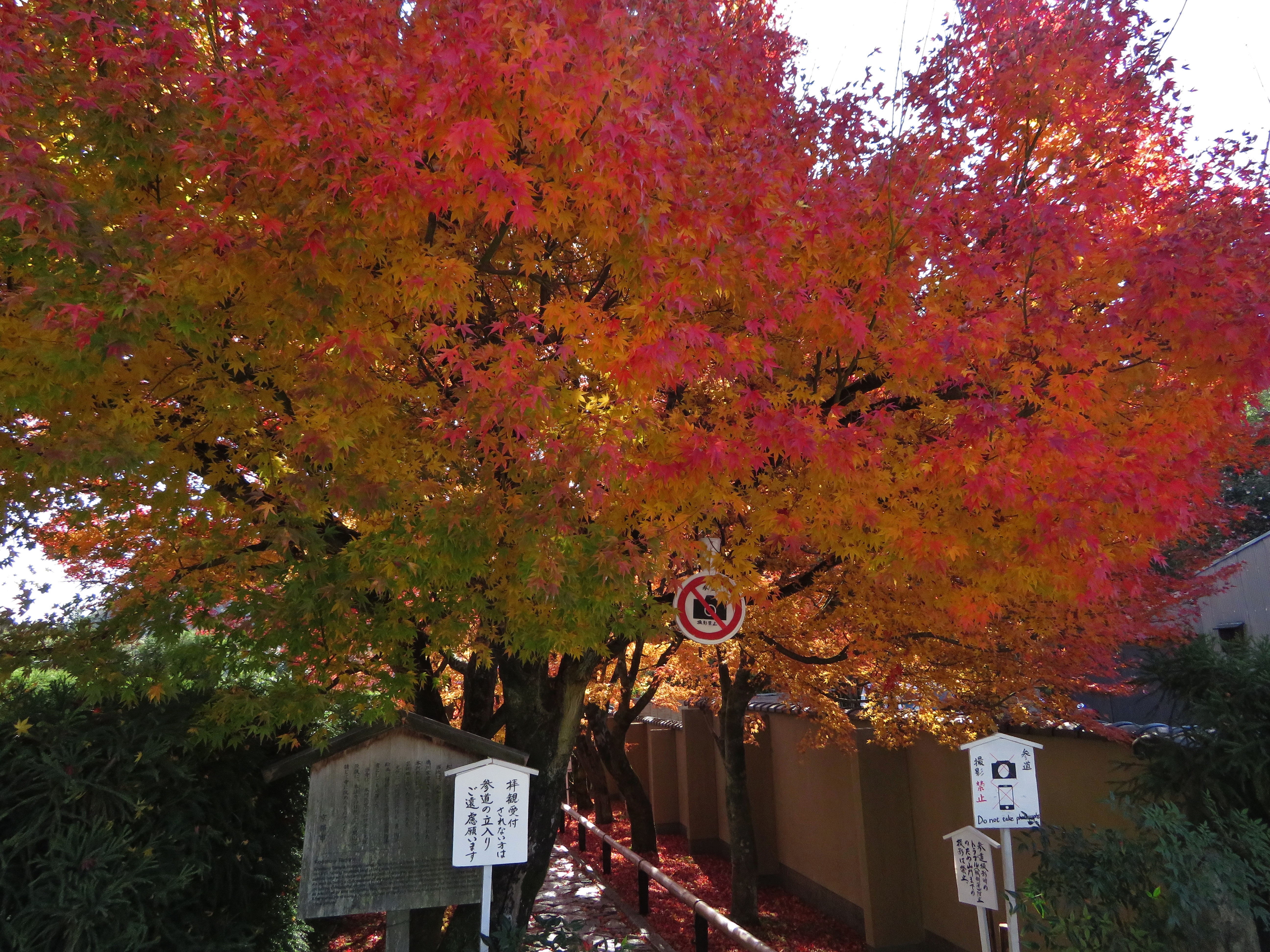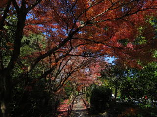 | 1枚目の写真、光悦寺の参道が最も良い撮影スポットなのですが、撮影禁止になって いました。受付の人によると、皆が此処で写真を撮ろうと大渋滞で、道路まではみ出し て危険なので、禁止にしたそうです。ピークも過ぎて誰もいなかったので、警備員の おじさんに頼んで、写真を撮らせてもらいました。少し盛りは過ぎていましたが、その 代わり観光客は数人しかいませんでした。 |