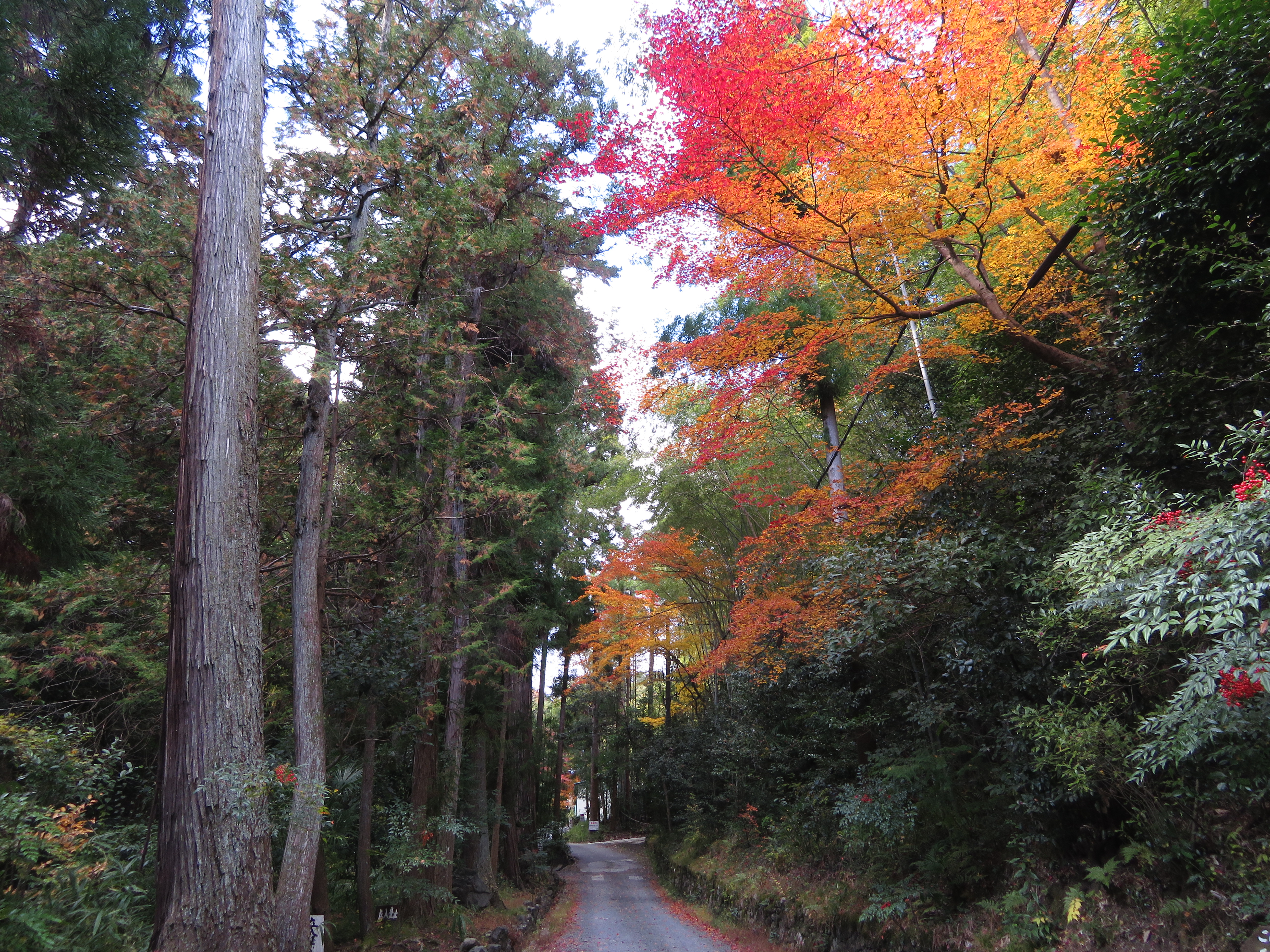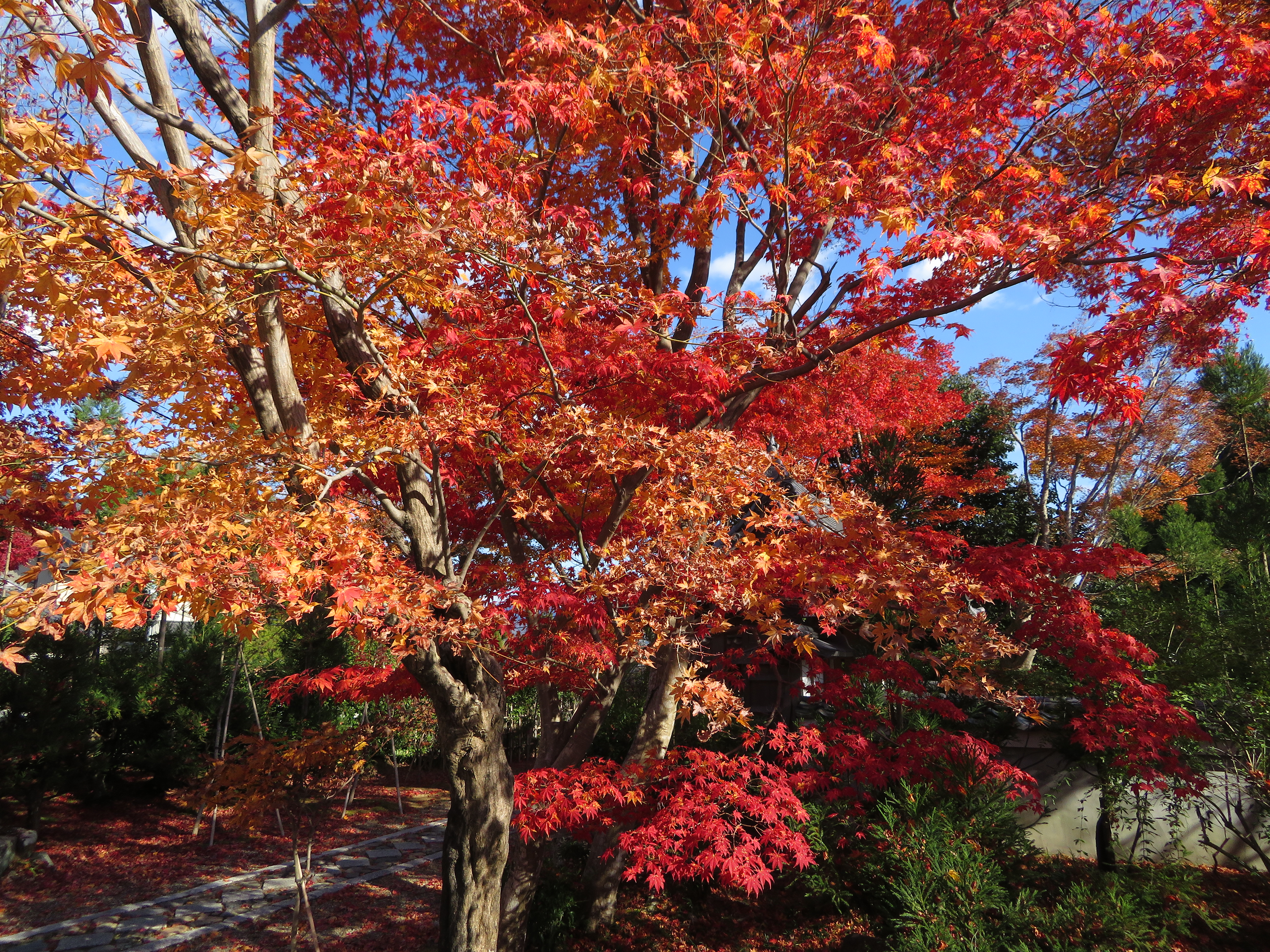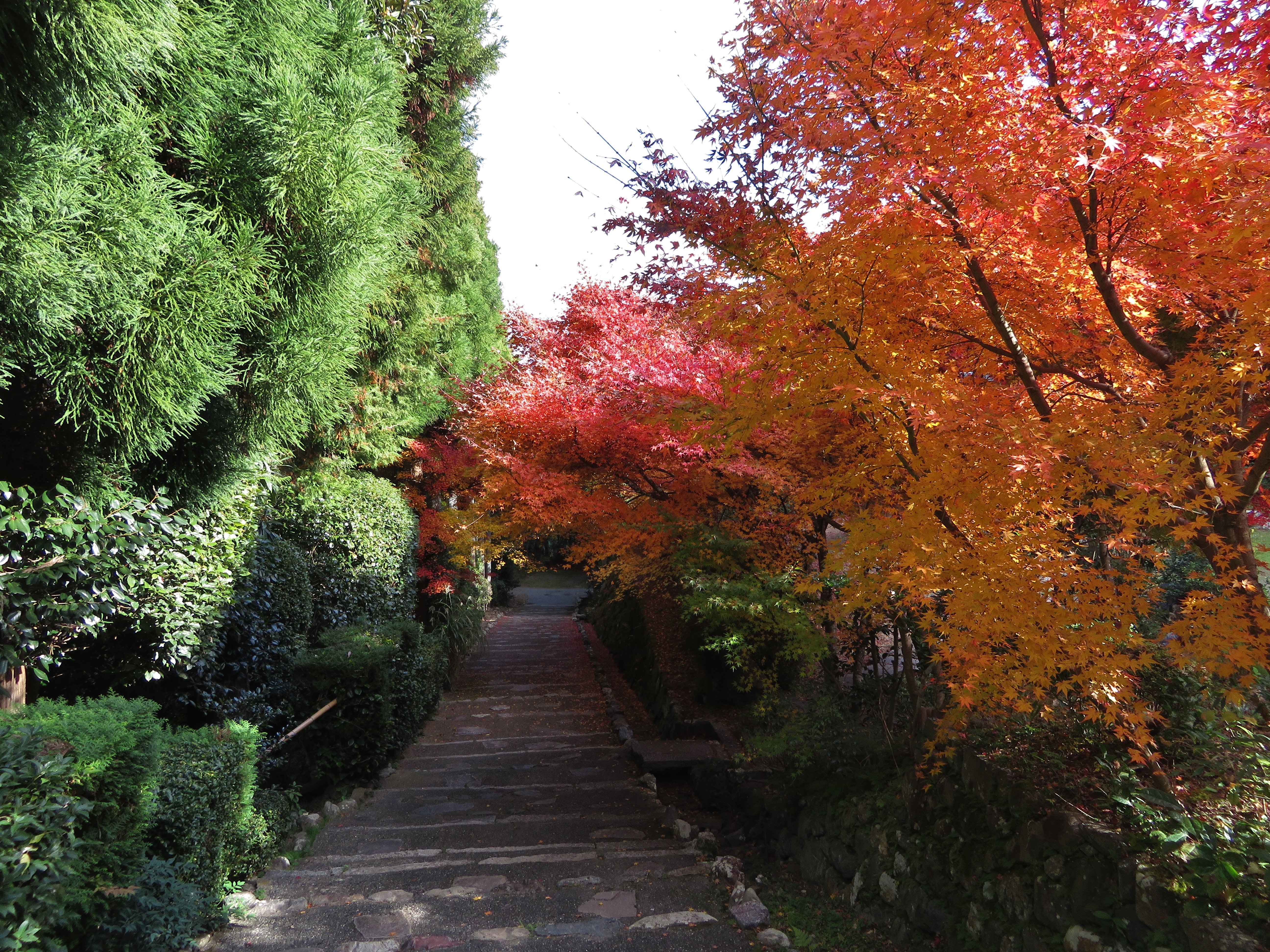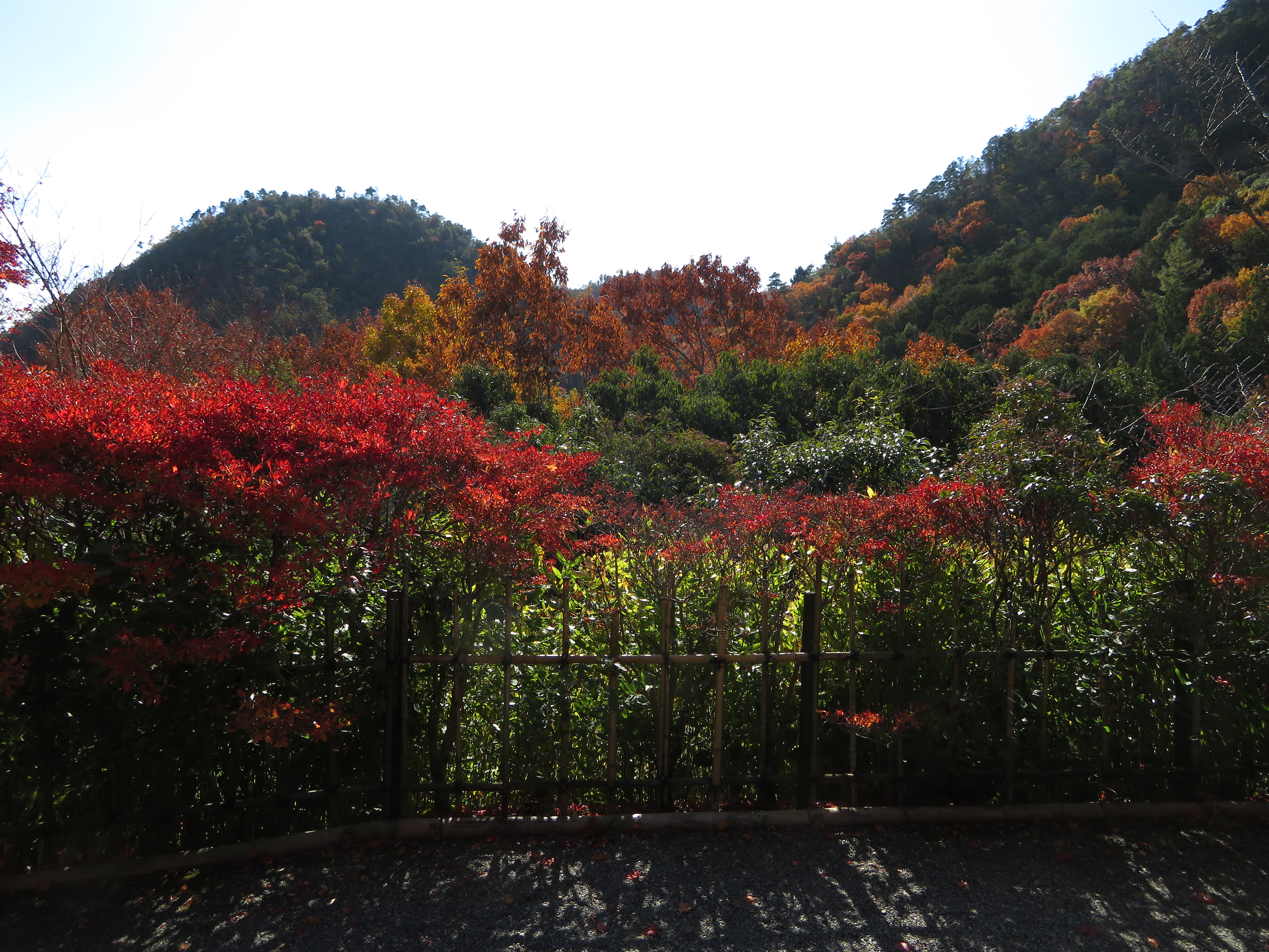 | 1枚目の写真、光悦寺の参道が最も良い撮影スポットなのですが、撮影禁止になって いました。受付の人によると、皆が此処で写真を撮ろうと大渋滞で、道路まではみ出し て危険なので、禁止にしたそうです。ピークも過ぎて誰もいなかったので、警備員の おじさんに頼んで、写真を撮らせてもらいました。少し盛りは過ぎていましたが、その 代わり観光客は数人しかいませんでした。 |