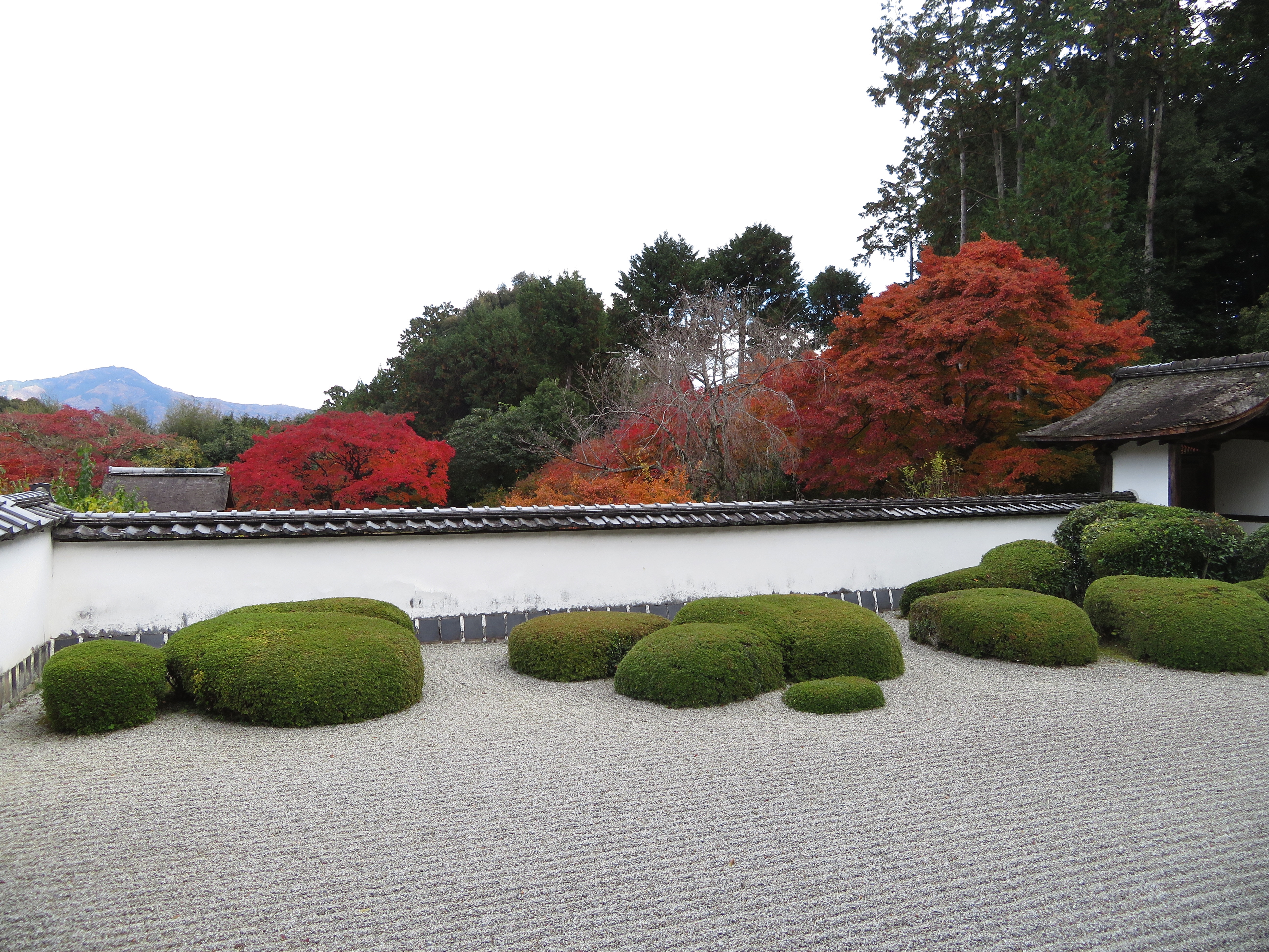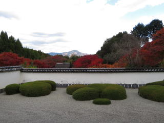 | サツキで七五三を表した枯山水で、獅子の児渡しと呼ばれます。 比叡山を借景にした、余りにも有名な借景庭園です。 |