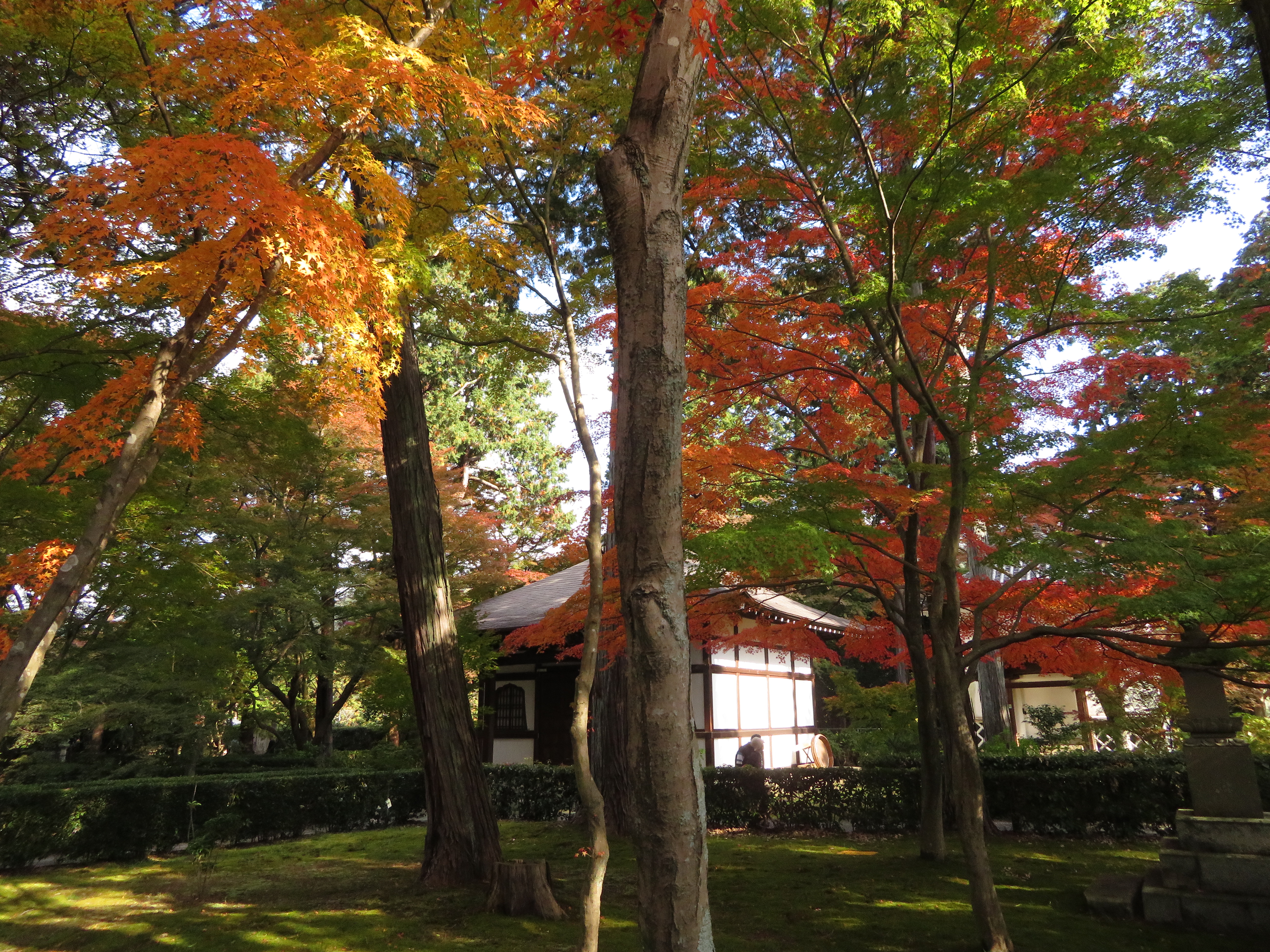 | 真如堂は今年も無料で綺麗な紅葉を見せてくれました。 本堂の裏だけが例年通り未だ色づき始めでした。 |