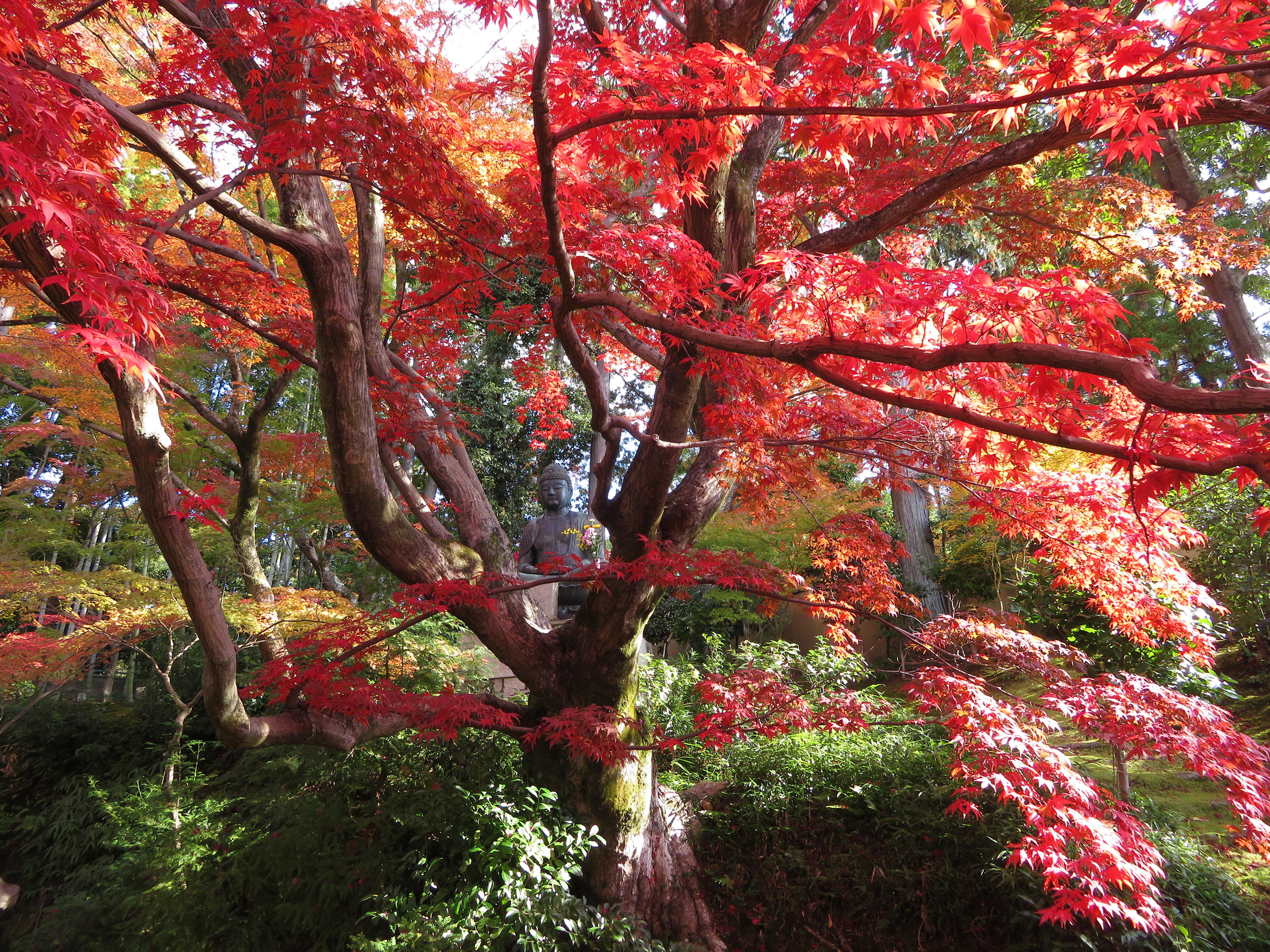 | 栄摂院は黒谷の塔中で、この時期だけ公開しています。以前は無料でしたが、 今でも志納と云う形で小さな箱が置いてあるだけです。 毎年訪れてますが、此処の紅葉の赤は見事です。 |