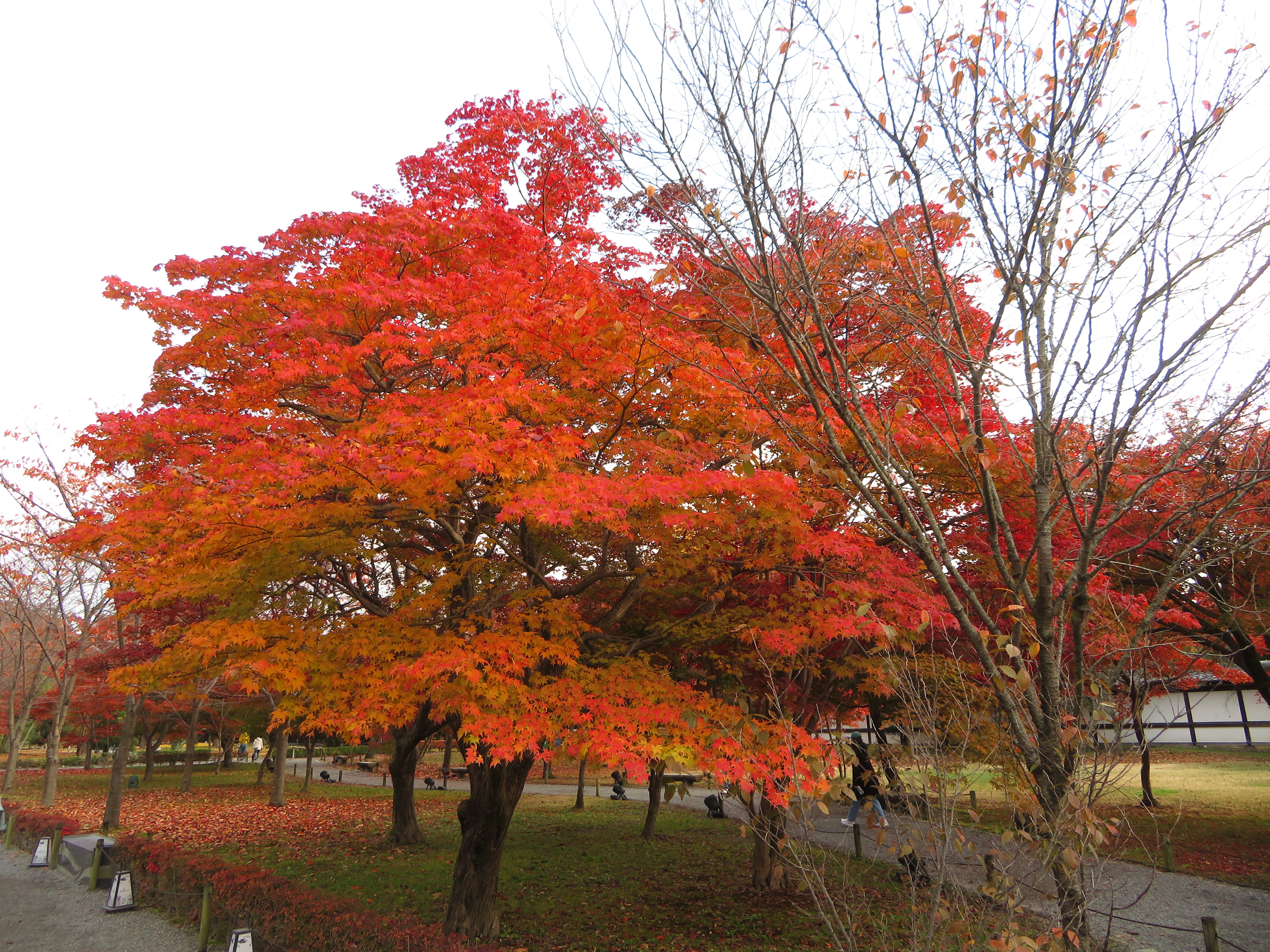 | 二条城は70才以上の京都市民は無料なので、散歩がてら紅葉を見てきました。 此処は、有難い事に二か所の喫煙場があって、助かってます。 紅葉の本数が少なくて物足りないですが、真盛りでした。 |