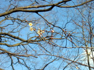 御所の梅林に、白梅が一本咲いていました。隣の出水の小川には、紅梅がかなり花を付けていました。