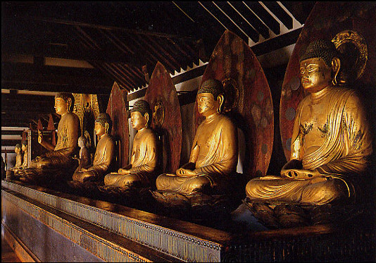 浄瑠璃寺説明書より転写 九体阿弥陀堂には丈六・半丈六の九品九生の素晴らしい九体の 阿弥陀仏が壮観です。 |