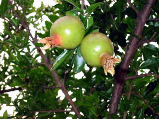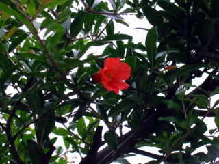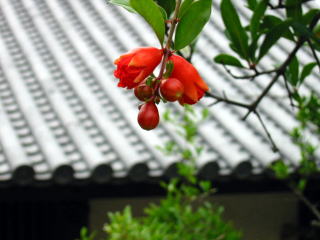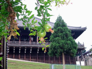 | 二月堂の前に柘榴の花と若い実がありました。 いつもここの実を採って食べたいと思っているので すが、次に行くと人の手では届かない高い所しか残っていませんので、悔しい思いをしています。 |