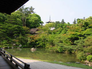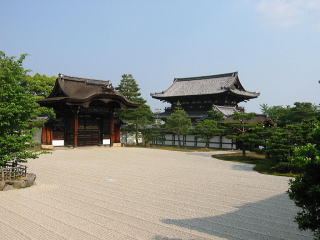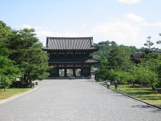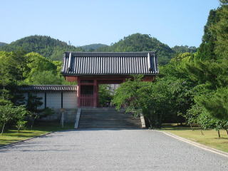 ![]() 中から山門を見たところで、後に徒然草を書い た吉田兼好の草庵があった双ヶ丘が見えます。 |