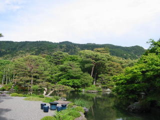| 借景の東山が前日の雨のせいか、とても綺麗に雄大に見えて、気持ち良い庭園でした。 |