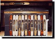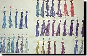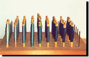 ボカシや各配色に使う色 糸を、竹管に巻き、それぞ れの杼に入れます。 |