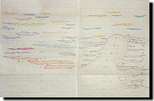 | 上の下絵と色見本は、topの 月明のモノです。全体で35色を使って 織り上げています。 |