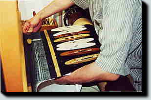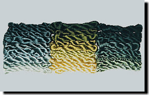 染めの着物ですと、色の濃淡 陰影を表現するのは、さして難 しくはないのですが、織りでは 二色の糸を徐々に間隔を狭め ながら織って、一つの色から次 の色へ移って行き、これを何色 も繰り返して全体の色を変えて ゆきます。 |