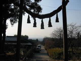 | 桧原神社(ひばら) 大神神社の摂社の一つ。 今回は霞で見えなかったのですが、この鳥居の間から二上山が綺麗にみえます。3月10、11日と 10月2、3日の日に二上山の雄岳、雌岳の間に落ちる夕日を一度見たいと思っています。 |
