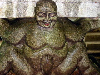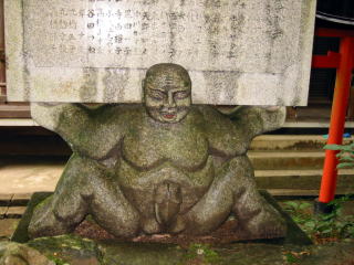 | 奥之院の裏にある愛染堂の前の像です。 愛染堂を建立した人達の名前を刻んだ石板 を担いでいます。 私はこの像のファンなのですが、前に立つと 思わず笑ってしまいます。 この像を作った人達の勇気とユーモアに脱帽! |
